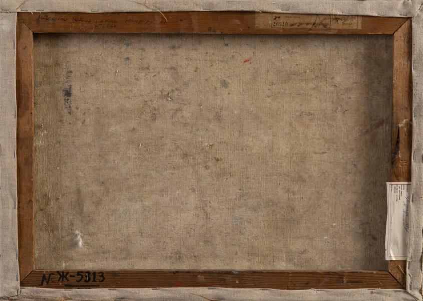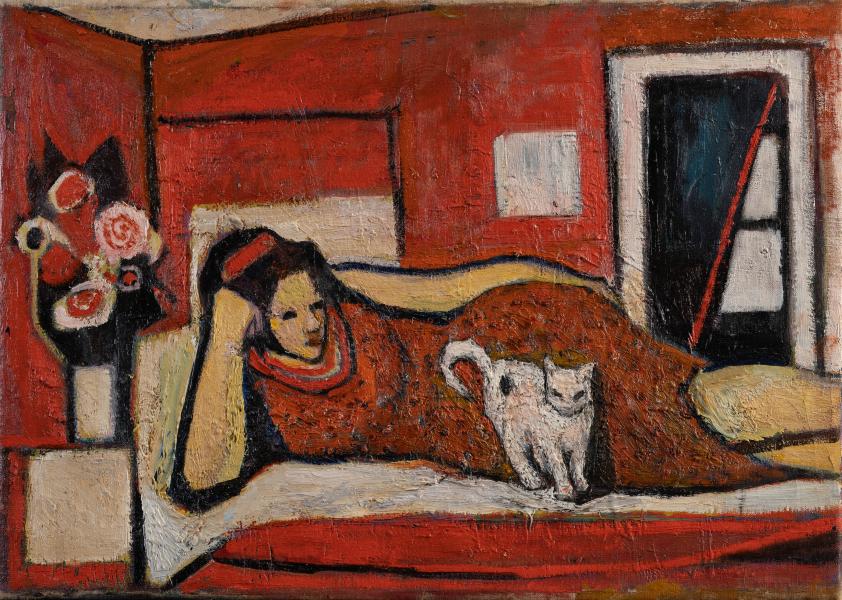 In the 1960s, Margit Selska began to turn to textured painting. The work "Woman with a Cat" belongs to this type of painting. The composition is colourfully intense, built on a combination of red, black and white-yellow colours, accentuated by facetious brushstrokes. In the centre of the painting, a woman is depicted lying on a red sofa, which is covered by a white coverlet against an orangish-red wall background. The woman is dressed in an orangish dress with dark dots, a white cat is depicted next to it. To the left of the sofa is a bouquet in a light-coloured vase, which stands on a cubic white and yellow stand. Along the right edge of the painting is a dark rectangular door stain in a white frame with a red line drawn diagonally across it.