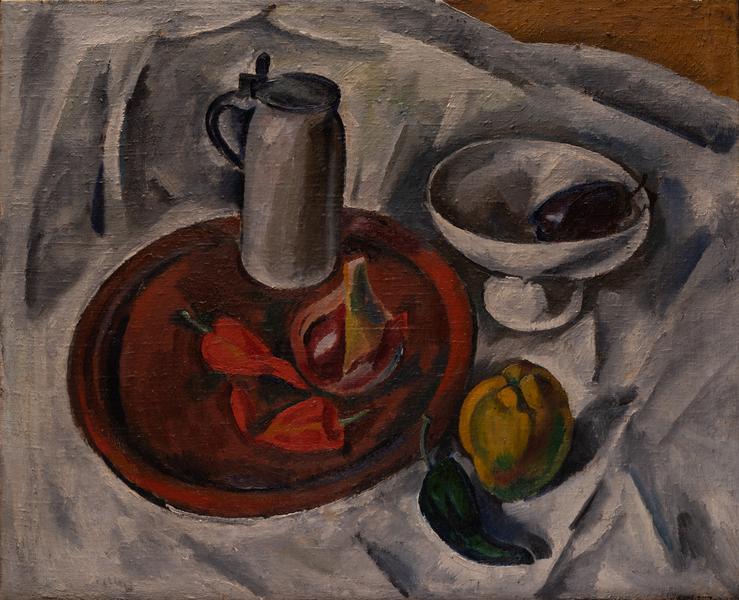 A light drapery with large folds occupies almost the entire surface of the painting. In the background on the left is a dark red tray with three red peppers, a pomegranate and a light-coloured mug, on the right is a white vase with an aubergine, below are green peppers and a yellow quince. The painting is rendered in light tones, sharpened by the dynamism of the folds of the fabric, conveyed by the grey and black colours. The work is influenced by Cézanne's simplified geometric forms (the folds on the tablecloth).