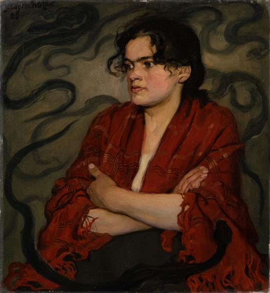 The work shows a half-length image of a woman on an olive-grey background with stylistic representations of snakes/grass snakes. The woman's black hair is disheveled, her body and head are turned three-quarters to the left and her gaze is also directed to the left. On her shoulders is a red kerchief that covers her breasts, leaving a narrow neckline open; the woman's arms are folded across her chest.