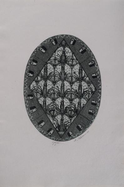 "June VI" is the third etching in the "Months of the Year" series. In general, the artist created six of them: March, May, June, August, September, and November. Each etching visually depicts an oval framed by an openwork ribbon with noseless heads and mouths open. A rhombus is arranged in an oval, with an "individual" image for each sheet in the field. The oval's outer borders are densely filled with small balls and conical thorns. The majority of the works within the borders of rhombuses feature women's busts wearing hats. They are seated on elongated bases that resemble fantastic zoomorphic creatures reminiscent of sepia (cuttlefish). According to the author, these compositional figures are the "horsewomеn of Time".