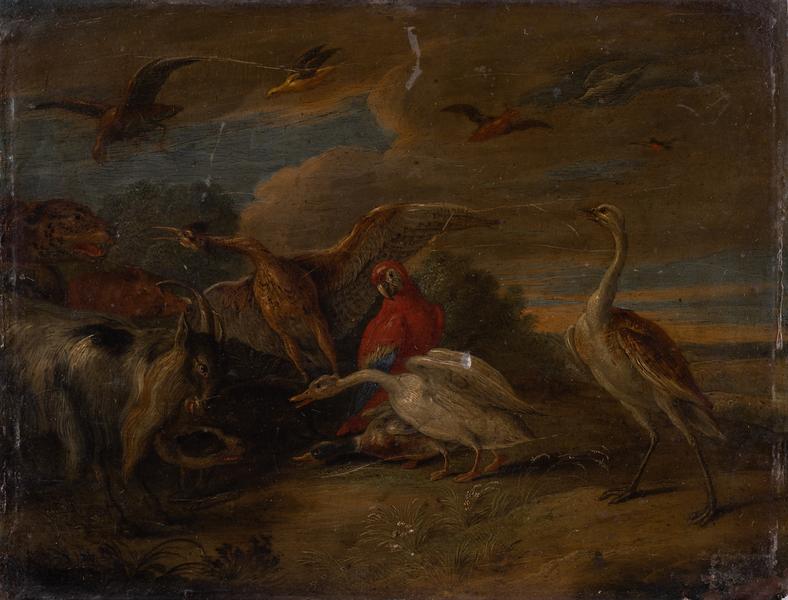 The artwork, credited to an unknown 17th-century Dutch artist, depicts an animalistic scene. Birds (a goose, a parrot, a duck, a heron, and a crane) are presented on the left, and animals (a goat, a ferret, a fox, and a cheetah) are on the right. They are getting into a fight, as evidenced by their bared teeth and outstretched wings. Such animalistic images were frequent in Dutch paintings of the time and had a hidden allegorical meaning. Popular moralistic fables and emblematic literature inspired the content of the works.