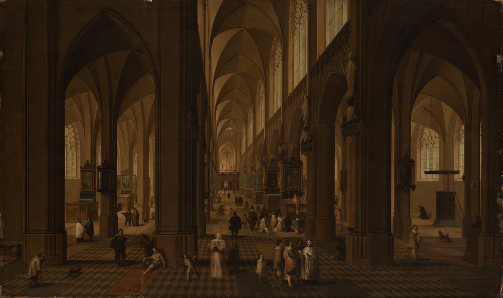 A group of Antwerp painters, including Pieter Neefs I, emerged in the 1580s. They used a clear geometric perspective to depict the space of the interiors realistically. Their works effectively reproduced the depth of the nave space, shown from a slightly elevated vantage point. "The Interior of the Antwerp Cathedral" is one of Neefs' many paintings representing the interior of the Antwerp Cathedral. Those artworks are very similar and differ only in the staffage and individual details of the decor. The Lviv painting shows a perspective view from the main entrance side. There are some figures in the cathedral in the foreground. Little further is a crowd of people listening to the priest's mass in front of the pulpit. Some figures, such as beggars or a woman giving an offering, attract special attention. They most likely emphasise the importance of offering as a Christian virtue. Frans Francken II, who frequently cooperated with Pieter Neefs I, created the figures in the work.