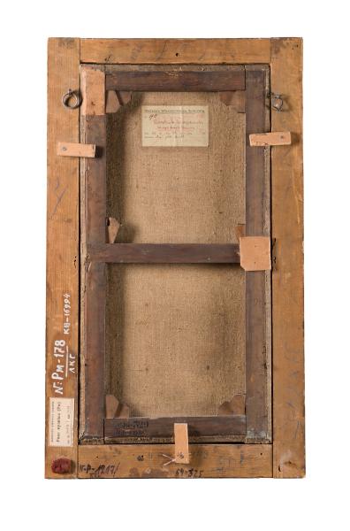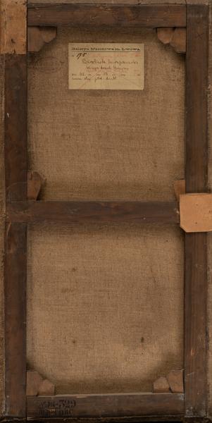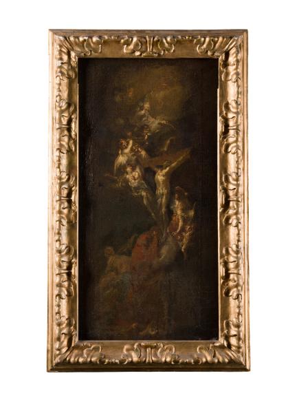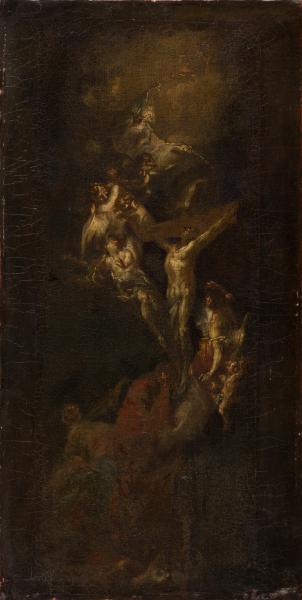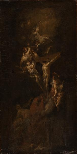 Although Franz Anton Maulbertsch is considered one of the most prominent colourists of the second half of the 18th century, he began to produce monochrome oil sketches in the 1760s. "The Crucifixion" can be attributed to this period. The work represents an allegorical composition about the crucifixion of Christ. A cross with the crucified Saviour is depicted in the centre, on a cloud. He is surrounded by angels and cherubs, whose figures are performed with quick and pastose strokes. God the Father appears in the heavenly light above, among the dark clouds. Franz Anton Maulbertsch created a monochrome composition in this sketch based on the contrast of dark tones and white pasty strokes, allowing him to reproduce the drama of the biblical scene. The work was most likely created as a preparatory sketch for the fresco ensemble or the altar.