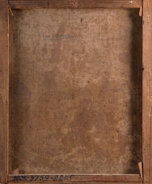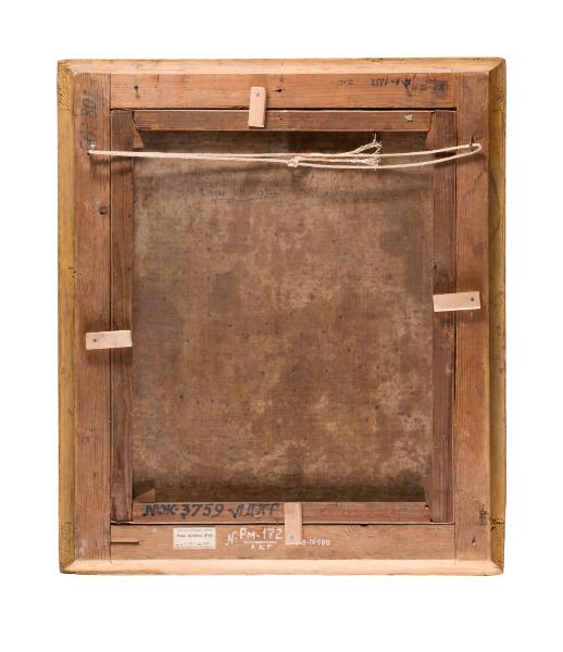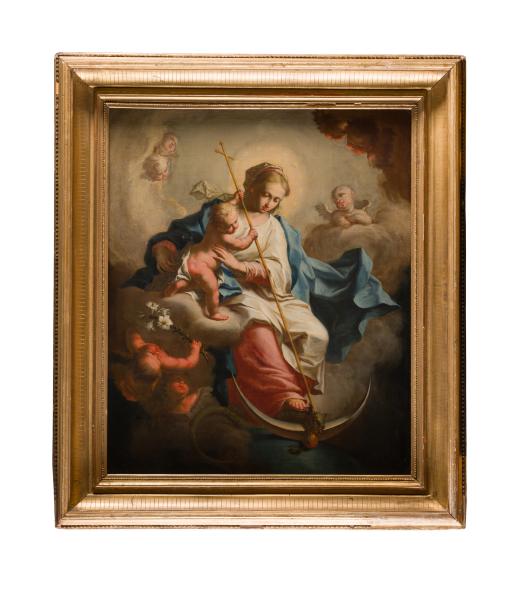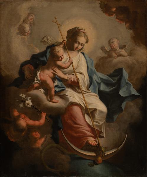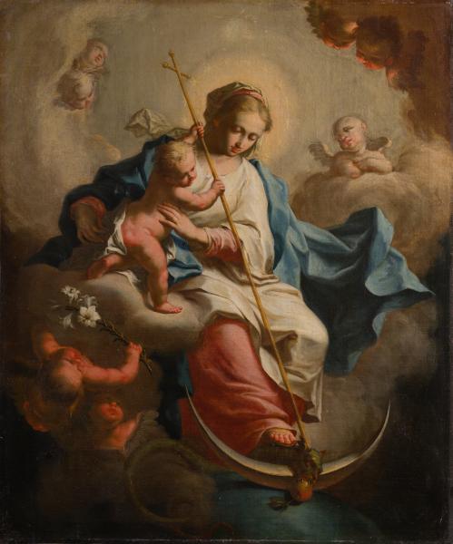 The painting demonstrates the traditional depiction of the Virgo Immaculata, an allegory of the Virgin Mary's Immaculate Conception. The iconography is based on the Catholic medieval doctrine that the Virgin Mary was sinless from the moment of her conception. Accordingly, art developed a well-established image of the Virgin Mary. Its task was to convey the doctrine's essential message through visual and symbolic images. The painting depicts the Virgin Mary with the Child on a heavenly throne. A crescent moon, a symbol of bodily purity and chastity; a globe; and a serpent with a fig in its mouth, a representation of original sin, are depicted under her feet. The Virgin Mary presses the serpent's head with one foot, demonstrating victory over it. Cherubs and angels surround the central figures. One of them is holding a white lily, symbolising bodily purity.