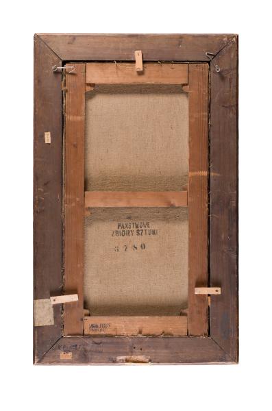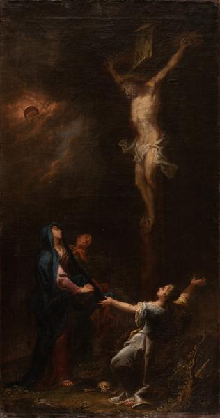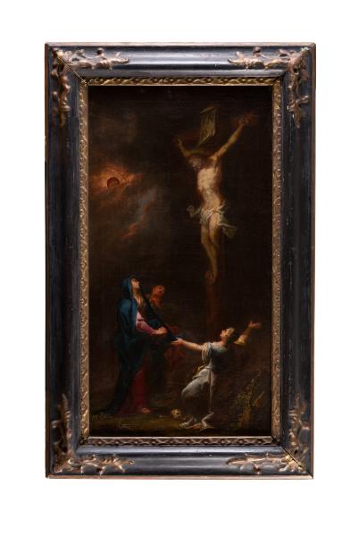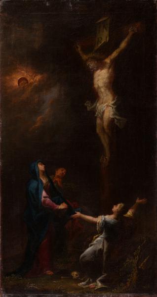 This small-sized canvas depicts the tragic scene of the Crucifixion. The cross with the crucified Jesus Christ rises against the dark background of the cloudy sky. The Virgin Mary, John the Apostle, and Mary Magdalene, who are mourning the execution of the Saviour, are depicted below. A skull with bones, the symbol of Adam and Eve's sin, lies nearby. The dark colour scheme with expressive contrasts of pale figures enhances the emotional effect of the scene. The author's style is similar to Martin Johann Schmidt's works. This work was probably inspired by one of Schmidt's compositions on the same subject.