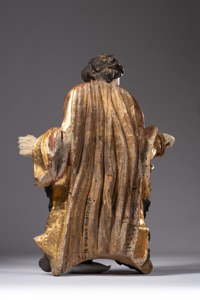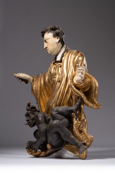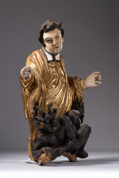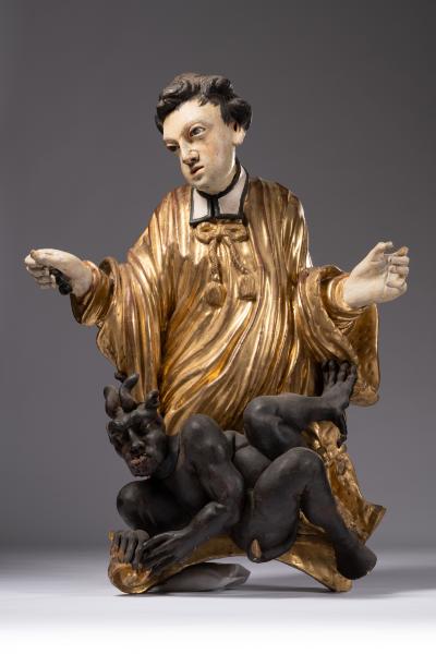 Nicetas was a Christian martyr of the 3rd–4th centuries. According to apocryphal texts, he was a son of Emperor Maximilian. Nicetas was known to be religious from a young age. After seeing God's Sign in his dream, he openly admitted to being a Christian. For that confession, he was tortured and imprisoned. When Nicetas was in prison, Beelzebub appeared before him as an angel, trying to seduce the saint. The sculpture shows the moment Satan revealed his true identity, and Nicetas vanquished him. The saint was traditionally represented as a warrior fighting against Satan. In this sculptural image, Saint Nicetas, the Vanquisher of Satan, is depicted as a young man in clerical clothing sculpted in horizontal folds falling down. The sculptor did not adhere to the correct proportions when carving the man. The tilted head of the martyr is framed by dark curly hair; his arms are outstretched. Nicetas is shown sitting on the vigorous Satan, depicted with horns and his tongue out. The influence of local colouring is evident in his work.