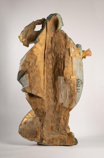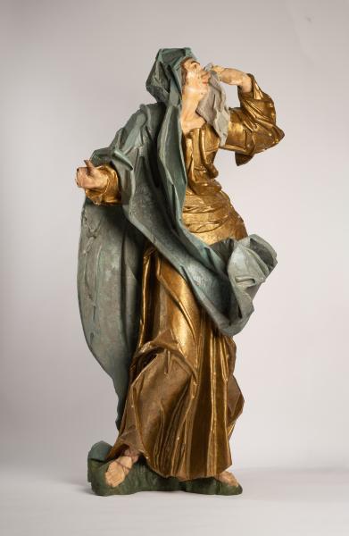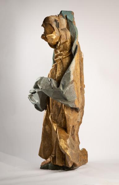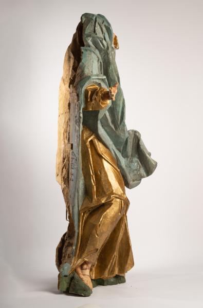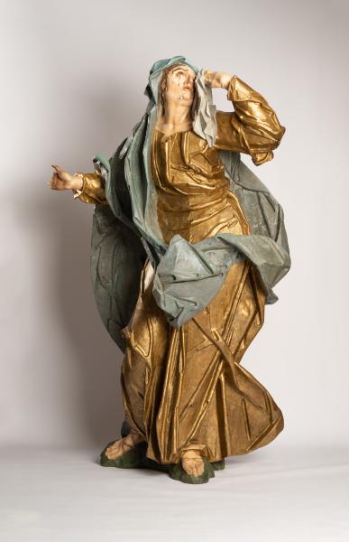 Around 1779, Jan Obrocki and Ignat Buraczynski created a volumetric sculpture for the main altar and pulpit in the Church of St. Stanislaus in Busk. Unlike typical iconographic schemes where several figures are placed near the Crucifixion, the St. Stanislaus Church altar composition features two figures – the Virgin Mary and John the Apostle. The elongated, dynamic figure of the Virgin Mary conveys dramatic, vibrant emotions. The facial features are skillfully carved: protruding cheekbones, a straight, pointed nose, pursed lips and teardrops rolling down her cheek. In the sculptor's characteristic manner, the somewhat coarse, dynamic lines of the garment folds are meticulously detailed, enveloping the Virgin Mary's body. The theatrical pose of the saint, with her head slightly tilted, is characterised by high emotional intensity and a realistic portrayal of the character. Jan Obrocki's works are known for a certain restraint and detachment in interpreting draperies, which can be observed in his creative legacy. In this particular piece, following the artistic style of Johann Georg Pinsel, the sculptor attempted to recreate his depiction of Mary from the Horodenka church.