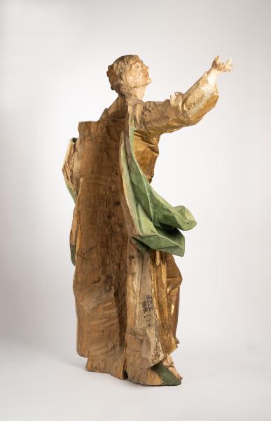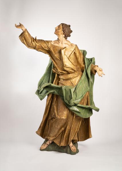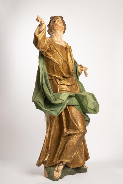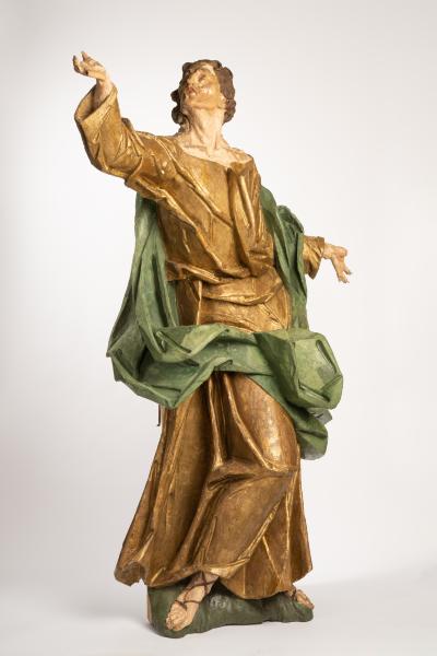 Around 1779, Jan Obrocki and Ignat Buraczynski created a volumetric sculpture for the main altar and pulpit in the Church of St. Stanislaus in Busk. Unlike typical iconographic schemes where several figures are placed near the Crucifixion, the St. Stanislaus Church altar composition features two figures – the Virgin Mary and John the Apostle. The saint's elongated figure is portrayed in an S-shaped silhouette (figura serpentinata), which dominated Baroque sculpture. John is depicted in a dynamic pose with theatrically outstretched arms. His head is raised, with a gaze directed upwards. Meticulously carved by the master, the figure features drawn together eyebrows, almond-shaped eyes, a straight nose with flared nostrils, prominent cheekbones, and hair gracefully framing the head in flowing waves. The saint's drapery and clothing are adorned with monumental folds, transitioning from smooth curves to geometric planes that follow the contours of the figure. There is a certain restraint in the portrayal of the saint.