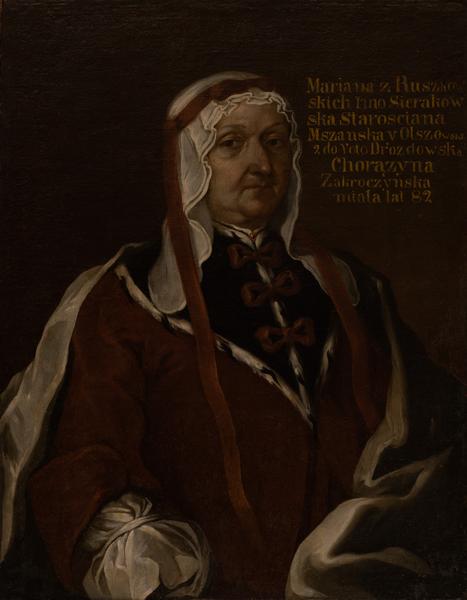 The work by Lukasz Orlowski, preserved in the Gallery, is a commissioned epitaph portrait of Marianna Barbara Drozdowska (1679–1756?), the daughter of Andrzej Rozkowski, a castellan of Inowroclaw. Around 1690, Marianna married Jan Serakowski, the pantler of Zakroczym and the elder of Mszana and Olszow. After 1706, she became the wife of Gabriel Drozdowski, the standard-bearer of Zakroczym. Marianna Barbara was the mother of Waclaw Hieronim Sierakowski, the Latin rite Archbishop of Lviv. The painting depicts an elderly woman turned in three-quarters, with her gaze directed at the viewer. She wears a namitka (a woman's head covering) with a long ribbon. To the right of her head is an inscription indicating her name and age.
