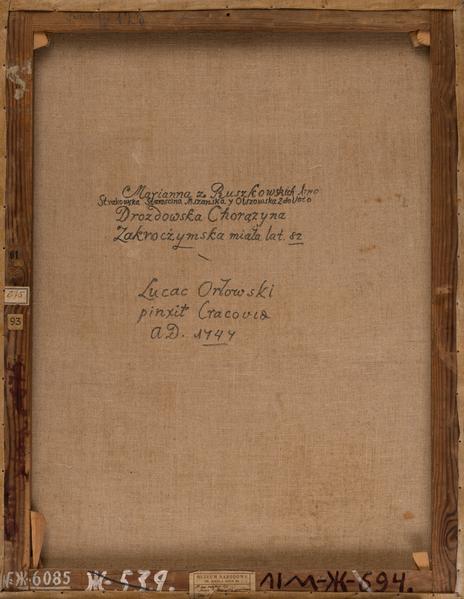 On the front side of the artwork: Mariana z Ruszkow/skich Imo Sierakow/ska Starosciana / Mszanska y Olszowska / 2do Voto Drozdowska / Chorazyna / Zakro- czynska / miala lat 82. On the reverse side: Marianna z Ruszkowskich Imо/ Strakowska Starosciana Mszanska y Olszowska 2do Voto/Drozdowska Chorązyna / Zakroczymska miala lat 82 / Lucac Orlowski / pinxit Cracovia / AD. 1747.