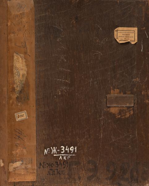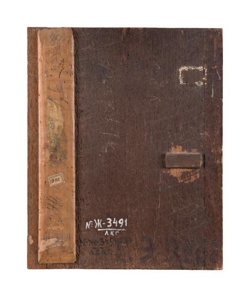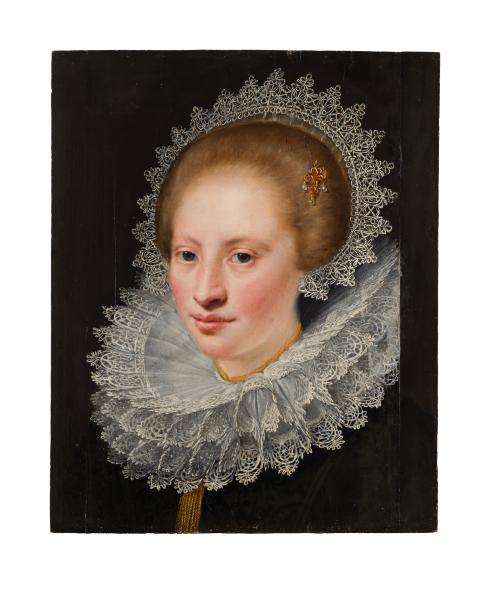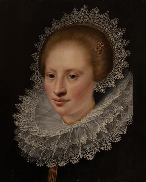 The work is a bust portrait of a young rosy-cheeked woman. Her head is turned three-quarters to the right, and her torso to the left. The large blue eyes of the portrayed woman in a dark dress are directed at the viewer. The person depicted in this Gallery portrait resembles the portrait of Mevrouw Vrijdags van Vollenhoven, which is preserved in a museum in Lille (France) and was painted by Jan Anthonisz van Ravesteyn. The same characteristic angle of the portrayed person and the head-turning can be observed. The light and shadow modelling of the face and its carnation are also similar. There is also a very detailed depiction of clothing and jewellery. Hans-Joachim Raupp, a well-known scholar of the Dutch Golden Age art, noted that fashion development was only prominent in elite circles. And in the 20s and 30s of the seventeenth century, black suits and dresses with white lace collars, often in the form of a ruffle, were popular. In the Gallery portrait, the subject's outfit looks more modest, and gold chains around her neck hang down from under the ruffled collar.