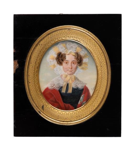 On an oval background of the blue sky, there is a depiction of an older, full-faced woman shown from the front. She is wearing a dark blue dress with a wide lace collar and a red shawl. On her head, she has a tall, lace bonnet with yellow ribbons tied under her chin. Two locks of hair are visible on both sides from under the bonnet. The frame surrounding the image is black wood with a metal oval.