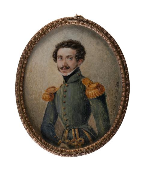 On a greenish background, a half-length image of a man is presented in a three-quarter turn to the left, with a gaze towards the viewer. He has curly hair; on his face, there are sideburns and a moustache. He is wearing a green uniform with golden epaulettes.