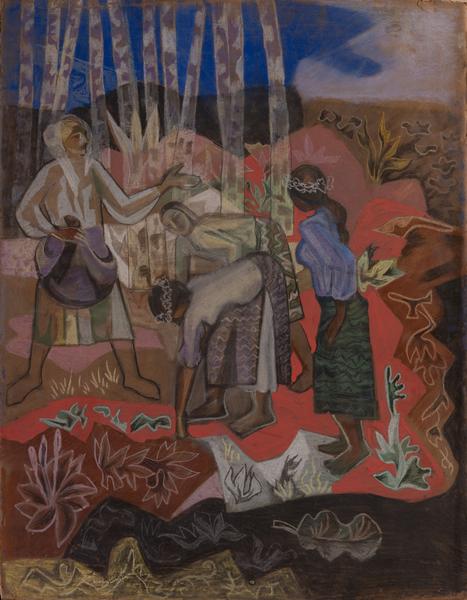 The artwork belongs to a series of thematic sketches executed in a mixed technique. The stylistic approach to composition combines characteristic modernist principles of interpreting individual elements and the overall imagery. The approach to form creation is decorative, and so are the colour combinations. The colour palette is diverse, with warm shades of earthy and ochre pigments predominating. There are individual splashes of ultramarine (the sky in the upper part) and whitened red (in the bottom). The viewer is presented with a scene where four women in traditional national attire (long linen shirts, zapaskas – rectangular aprons, and skirts) engage in an unspecified gathering activity in a forest area. It is difficult to visually determine what exactly they are gathering due to the stylisation. All the characters are depicted barefoot, indicating a warm season. There is a specific age gradation between the women: the woman on the far left is depicted wearing a headdress (namitka), which denotes marriage; the woman on the far right and one woman in the centre are wearing flower wreaths, which young girls wore. Two women in the centre are depicted bent over the ground, while the two figures flanking the composition stand at full length. Essentially, we are presented with a scene of dialogue with elements of morality (a characteristic hand gesture of the woman on the left). However, the approach to the stylisation of the trees against which the scene unfolds encourages a broader interpretation of this picture, as the "illusiveness" of the event's context may hint at its timelessness and the overall symbolism of what is happening here.