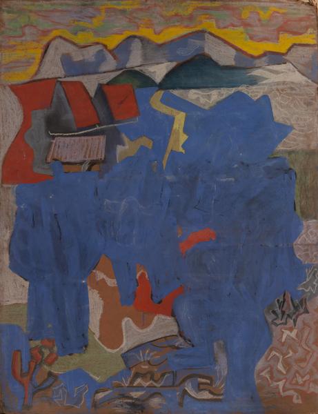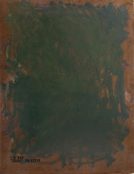 The stylistic of the artwork is consistent with the sketch Г-ІІ-336. The composition is also asymmetrically arranged, with a predominance of cool hues, tonal and colour accents. The style of the upper part of the work with architectural objects and mountains, to some extent, resonates with the painting practices of the Arefiev Circle ("Order of the Beggars", 1950–1960). Yet, the overall execution is original and more subtle. The composition's primary element is the asymmetric water surface. The localisation of stylised structures is likely a representation of high water; along the horizon line is a series of rocky mountains of grey-ultramarine shades, contrasting with the sky of a rich tone, almost cadmium orange.