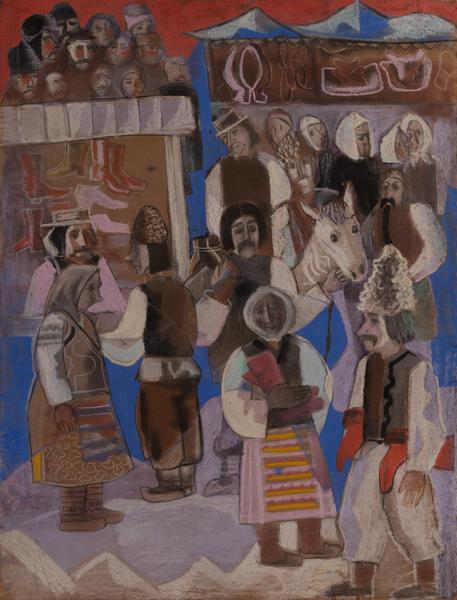 The sketch belongs to a series executed in the Lviv Leather Enterprise murals (1980). Today, the artworks are lost. This piece is dedicated to recounting the history of leather production, not only in the context of skin processing and obtaining the final raw material – in this case, the viewer can also discover what range of consumer goods were made from these materials until recently. A scene unfolds at a fair where craftsmen sell saddles, yokes, bridles and other parts of horse harnesses, and women's and men's footwear (red boots) for casual and festive occasions. The seasonality of the characters' clothing and the types of shoes purchased indicate that this takes place before a religious holiday in spring or autumn. The fair assumingly takes place in the Hutsul region (a woman in the foreground wears a characteristic orange zapaska – a Hutsul rectangular apron, and several men wear distinctive bryls – male straw hats, and postoly – traditional leather shoes). However, it could be another ethnographic region (the tall fur hats resembling kuchma style are more typical of areas bordering Moldova). Unlike most other mural sketches, the figures of all the characters are more realistic; the colour scheme is cold (ultramarine, cold earthy shades, and whitened purple), with minor warm accents (red and orange). The composition is arranged in several perspectives: in the foreground, a man and a woman on the right side are walking, having just bought a pair of sapiantsi – ankle leather boots. In the left part, further away, a man and a woman are standing next to a footwear stall; the man is actively communicating with the craftsman-vendor. Slightly further back on the artwork's right side, another man is leading a horse he bought a leather collar for. There is a stall with horse tack at a distance, and three men and five women are standing close by, their backs to the counter. A large group of men and women is depicted in the far right corner of the composition. The viewer can only see their heads: some faces on the right side are blurry, and presented rather decoratively. Six of the characters have vibrant, as if tinted, red cheeks. This focus on detail is significant because in the practice of Bukovinians, particularly during the Krasnoilsk Malanka festival, there was a tradition of painting the participants' faces this way, regardless of gender. However, the latter is difficult to assert given the relatively light clothing of other characters for this season, although the presence of certain headwear styles characteristic of the region also suggests that the scene may not take place in the Hutsul region.