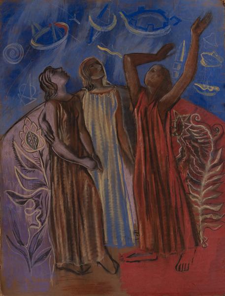 The mural depicts three allegorical female figures with long, loose hair wearing antiqued clothing (tunic-like dresses with characteristic decorative folds) but barefoot. These figures stand on a disc-shaped surface of purple, ochre and carmine shades with a distinctively rounded edge. On both sides, the women are flanked by blossoming plants, resonating with phytomorphic motifs of Ukrainian decorative art. All women are depicted in full-length, with their faces turned towards the sky. The central figure, dressed in light-coloured attire with shades of yellow and ultramarine, embraces the figure on the left, wearing a yellowish-ochre tunic. The woman on the far right, dressed in red, is depicted close to these two characters but without physical contact. Additionally, her hands are raised above her head, and she is actively gesturing. The absence of facial expressions suggests that she is not so much commenting as pointing out what is happening in the sky above them. In the sky above the figures, numerous objects related to space flights and stratospheric exploration are depicted (including carrier rocket "Vostok" and likely the R–5 ballistic missile or a guided aerial bomb), as well as a series of unidentified stylised aircraft (the shapes of the two objects in the sky next to the woman on the right side resemble a bathyscaphe and a submarine). Overall, the composition is symbolically allegorical. In using attributes, it would be possible to interpret these figures as three muses (for example, Urania, Clio and Polyhymnia). However, due to the stylised nature of the images and the absence of additional symbols, they should not be definitively interpreted as muses or even as the Three Graces since a solid connection to scientific and technological progress dominates the narrative. The composition is balanced and monumental, partly reminiscent of the practice of Puvis de Chavannes or European modernists of the interwar period. The colouring is mixed and harmonious, with occasional tonal accents.