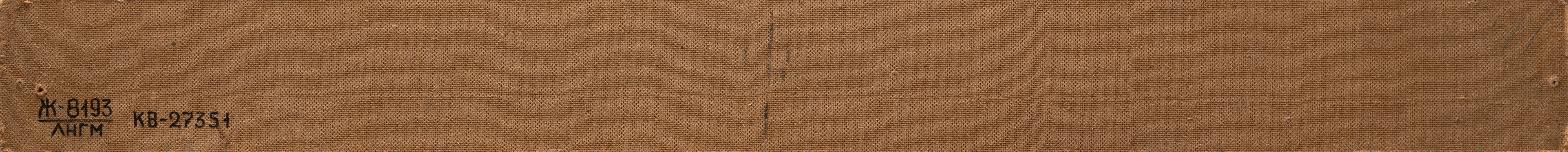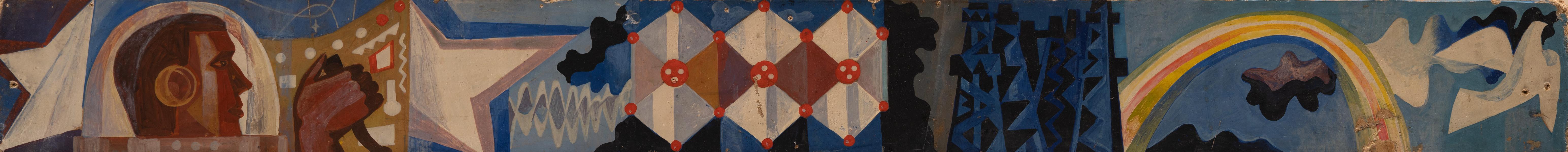 Based on the parameters, the sketch belongs to the same series as Ж-8192 and is dedicated to the visuals of high-tech energy. The composition unfolds from left to right, starting with a shoulder-profile depiction of an energy worker in protective gear, likely an employee of a nuclear power plant, performing necessary manipulations and monitoring the equipment. From this image, the perspective extends to, presumably, a stylised depiction of active zones of heterogeneous nuclear reactors, with a double curve of an oscilloscope (or a symbolic representation of an electromagnetic wave) positioned between them. Gas production towers are depicted next to the central image on the right side. Against the background of stylised clouds and skyline are symbolic images of a rainbow and a white bird (dove). The general idea of the composition reveals the technical aspects of the energy industry and its significance in peaceful everyday life. It is important to note that the stylistic approach used by the artist aligns with the general tendencies of Soviet modernist monumental art on both formal and symbolic levels. This ensured the recognition of stylised motifs and symbolic imagery. At the same time, the harmonious palette, colour scheme, and the absence of contrasting aggressive aspects were intended to contribute to the environment's compliance with the functional purpose and the contemplative mood of visitors.
