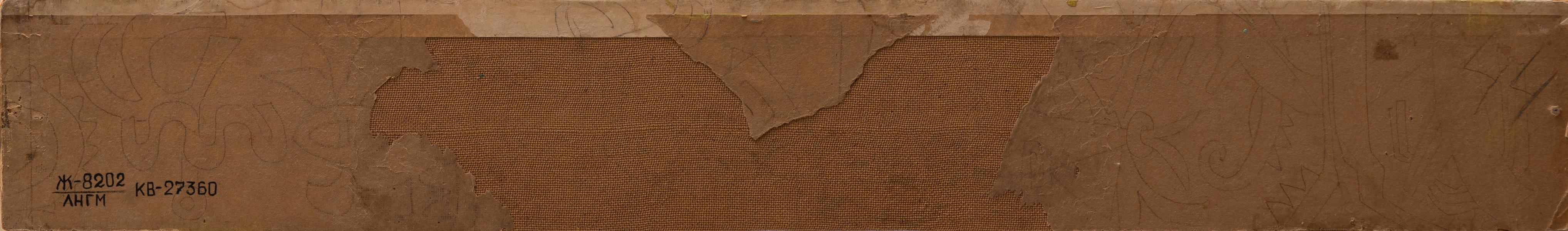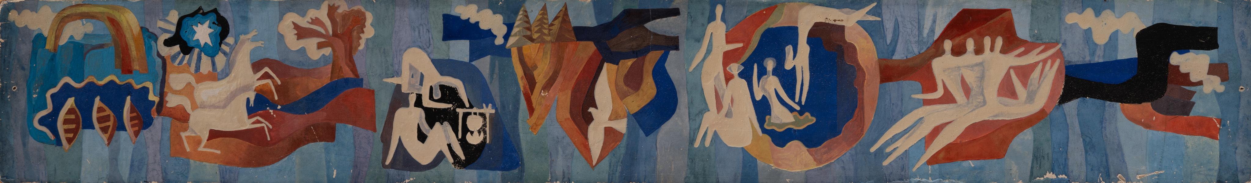 The work is one of the sketches for the murals, possibly created for a sanatorium complex. The artwork's aesthetic is consistent with the practices of monumental and decorative art of that time, featuring a distinctive approach to stylising the images. The composition, essentially a horizontal narrative divided into seven thematic sections against a decorative background, is likely inspired by artists such as Hans Arp, Henri Matisse, and Henry Moore. It is notable for its "biomorphic" approach to depicting individual skeuomorphic patterns and unidentified objects. The first image on the left simultaneously depicts the motifs of boats, water environment, and sky, defying the laws of physics by combining or demonstrating the combination of different perspectives where the materiality and physicality of clouds are no less dense than the vehicle's hull. The next scene is a simple depiction of horses spending time in nature. Still, the solar motif in the upper left corner references Helios chariot's iconography. The next scene depicts two travellers preparing food over a campfire, smoothly transitioning into a different depiction of a landscape with distinctive, almost iconographic rocks, trees, and a bird. Besides these scenes, a group of four people resting on the water is depicted next to a crowd of athletes, running synchronously (the approach to stylisation and composition typical of Soviet sports iconography suggests this). Overall, the composition is cohesive, with a harmonious use of colour and tone. The predominance of calm and light tones suggests that the mural was intended to create an appropriate atmosphere in a space associated with various active and contemplative leisure options.