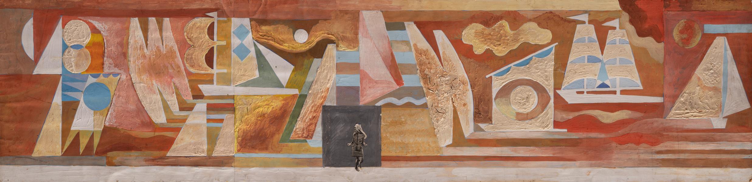 The sketch is a variation of a design on ancient and modern sailing history. The decorative approach to interpreting certain sailing ships and boats, the elevation of certain elements into high textured relief, and the scale (which can be easily determined by the size of the portal and the figure of a person placed on it to establish proportion) allow the viewer to feel immersed inside something comparable to a massive diorama. The artist's colour and tonal approach to the composition ensures the integrity of the imagery, even in the chronological and regional distance between the depicted objects. However, there is a possibility that, for example, the archaic Egyptian sailing ship is the Ra boat from the project of the renowned Norwegian explorer Thor Heyerdahl (1969–1970). The famous Soviet doctor, journalist, and traveller Yurii Senkevych participated in those expeditions. Since the sea (ocean) and the skyline are painted in warm ochre and carmine colours, a specific tone of detachment appears, making it difficult to tell whether the sailboats are flying among the clouds or floating on the water. Additionally, the composition progresses from geometric abstraction (in the left part) to the distinct silhouettes of different sailing ships, transitioning from abstract figures to recognisable objects. The dominant optimistic mood and the whimsical lightness, where fantasy becomes almost fairytale-like, likely indicate the recreational purpose of the building where the mural was to be executed.