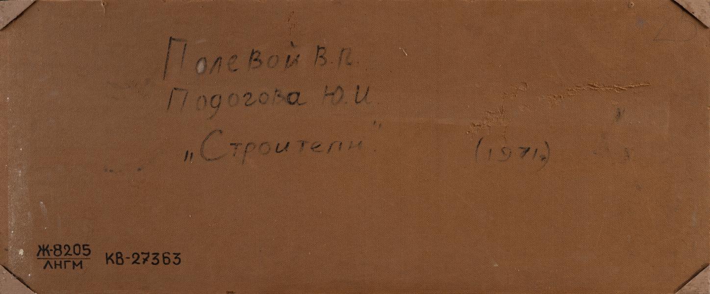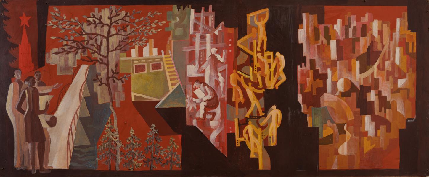 The work belongs to the series of sketches for the mural "Ruthenian Architects", where the author's reflections on the architecture of the future appear alongside images of the present. By the general characteristics, the sketch is executed in a harmonious warm colour palette with some tonal accents. The left part of the composition conventionally denotes time, containing not only the history of the buildings but also the way people transform the landscape with bridges and industries. Additionally, the motifs of trees were introduced, combined with architectural objects, to create a comprehensive image of new cities. The figures of the three architects in the left part are hierarchically larger than the builders in the centre. The style of clothing and the interpretation of the figures suggests that this is a kind of "collective portrait" of young generation designers working for the state bureau. The composition's central part with the builders' figures conveys a story of radically new approaches to constructing buildings. The use of metal structures made with electric welding or assembled in other ways allows us to imagine what the future temple city will look like. The right part of the composition is dedicated to envisioning the future of architecture, taking on a complex yet harmonious form. It is difficult to visually determine the materials used by the builders of this new, possibly 21st-century. However, the entirety of the image, the emphasis on abundant light, and the unique interplay of colours and tonal ratios suggest that the idea of architecture as a marvellous "frozen music" will still prevail there.