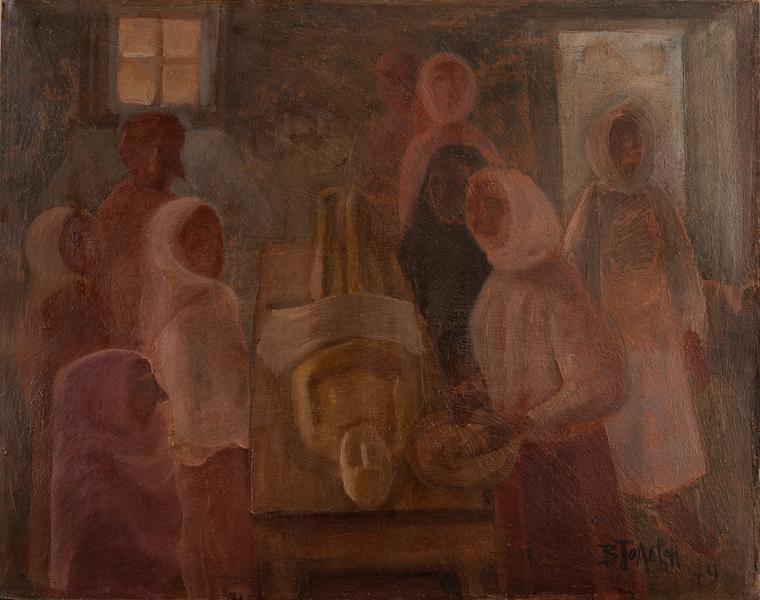 At first glance, the depiction of a rather ordinary and everyday scene is presented in a particular interpretation that takes it to a qualitatively different level of symbolic narrative. The author captures a scene of preparing the deceased man's body for the funeral rite, but the approach to the composition allows us to look at the table with the deceased and the room he is in from two points of view. The first perspective is ordinary, as one would expect from a viewer who enters that space. The second perspective is deliberately and drastically elevated, as if from the ceiling. This approach creates an impression of "otherworldliness" and immerses the viewer in the disposition of the deceased's soul. Similarly, the sunlight streaming through the window on the left side of the composition and the opened door on the right side, accompanied by diffused light from an unidentified source, contribute to the unique mystical atmosphere of the artwork. The colouring is complex, nuanced and developed in a warm range. In the centre of the composition is a tonal accent – the figure of an elderly woman in black (a relative of the deceased). The overall approach to stylistic composition aligns with the "severe style" principles. In terms of form and symbolism, there is a connection to the works of Viktor Popkov, namely "Widows. Memories" (1966), "The Northern Song'" (1968), and "Father's Overcoat" (1970–1972). In addition, this painting reveals the results of a creative dialogue with artists of the 1960s–1970s, such as Andrii Vasnietsov and Ihor Obrosov. That is why the author creates an impression of lightness in the mixed colour scheme and compositional structure without excessively mournful notes. Even the interpretation of the deceased's body suggests the image of a peaceful person at rest (an allusion to the Easter exapostilarion "In The Flesh You Fell Asleep"). Nine women, whose silhouettes are discernible, stand around the table with the deceased. Moreover, judging by the hints and outlines, more people may be in the room. The characters are dressed in simple attire, with virtually no specific regional details. Based on their outlines and the presence of headscarves, it is likely that they are over 30 years old. The interior is more in keeping with a rural home, which also contributes to an ascetic and balanced mood, consistent with the "severe style" ideas. However, it is worth emphasising that this is a rather complex and transitional scene, bordering between worlds rather than simply reflecting the artistic practices of that time.