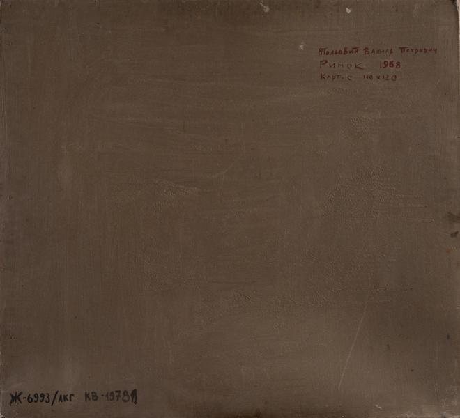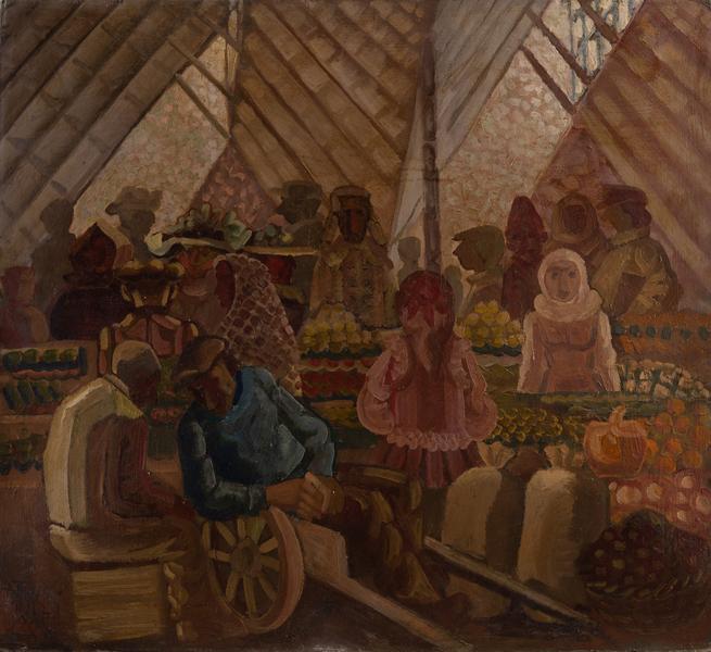 In this artwork, the author depicts what appears to be a genre scene in a covered market where people could sell their agricultural produce during the Soviet time. The variety and specificity of the displayed goods indicate that it is an autumn season when the harvest has already been gathered; hence there are practically no spring or summer crops. The right side of the composition depicts a pumpkin, typical baskets with beets and onions, apples of various kinds, and sacks, probably with potatoes. Sellers and buyers are dressed according to the season. The artist captures the contrast between what the townspeople wear (coats, jackets, fur hats, and caps indicative of the era's fashion) and the villagers' clothes (traditional corsets – kersetkas, pleated skirts, and uniquely tied headscarves). By capturing the specific scattered lighting, the scene's space vibrates with colour and tone, becoming almost mosaic-like. A complex, warm range of almost golden hues provides the backdrop for micro-stories unfolding in the pavilion. The foreground depicts something the buyer does not see, as the viewer is positioned on the other side of the counter. Here, a woman stands with her back to the viewer, wearing a rather unusual rose madder and purple outfit with whitewashed segments. Next to her on the left are many goods waiting to be picked up – in bags, baskets, or stacked in a large pile. To her left, there are two men. An elderly man, likely a war veteran, sits in a wooden two-wheeled cart, wearing a warm blue sweater and a cap, leaning towards his conversation partner. The other man sits on a wooden crate, almost facing away from the viewer, dressed in light ochre-coloured attire. Behind the counter is a woman wearing a large light-coloured down headscarf and a man with a distinctive headdress (resembling a tasselled kresania – a traditional Hutsul felt hat). To the right of the woman stands a girl of Eastern appearance in light clothing, wearing her namitka (?) – a traditional white headdress – in a unique way. The characters in the background, walking between the rows or standing behind the counters, illustrate the diversity of society, bringing together genre anthropological scenarios of behaviour and everyday practices. Among them is a woman in elegant, antique headwear and ordinary workers. This approach refers to the philosophical understanding of what this world is: diverse, varied, yet tightly interconnected. The artist partially revisited this theme in one of his works of the American period, but in a completely different colour scheme, with the active use of ultramarine.