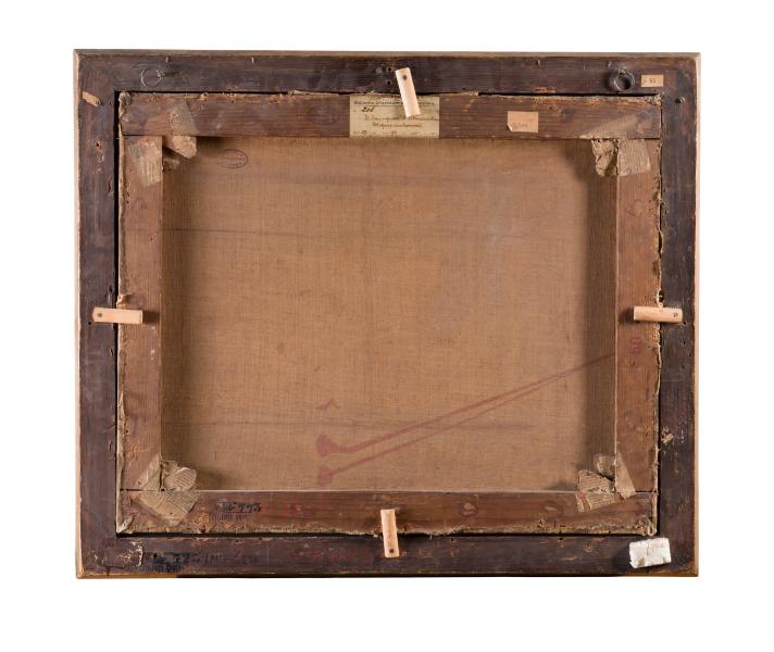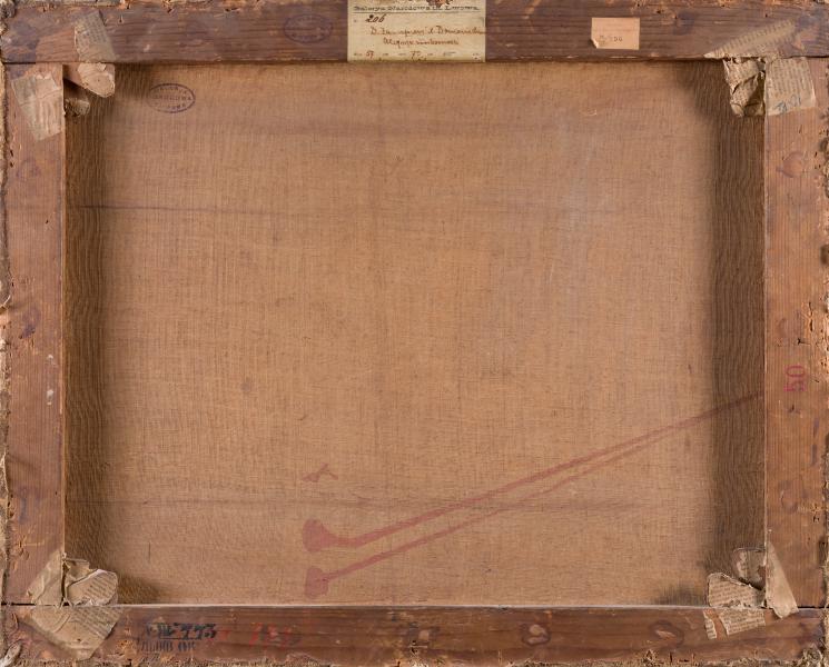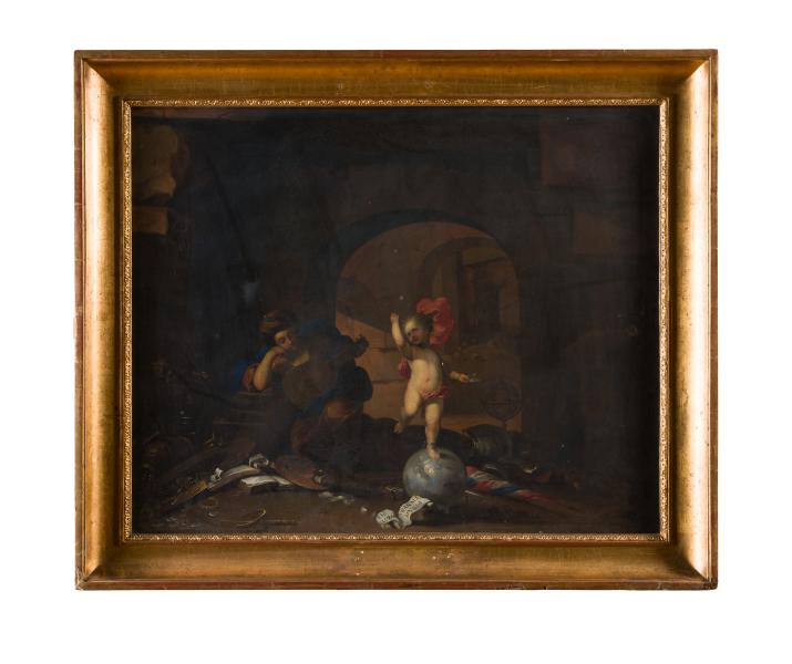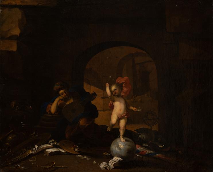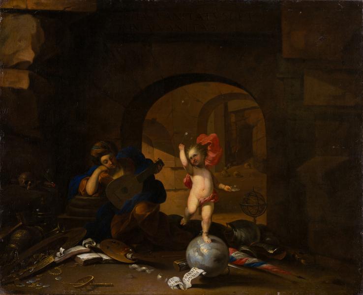 The painting depicts a young Cupid standing before the viewer on a globe. Various objects are lying beneath him, including books, a palette with brushes, coins, jewellery, a sceptre, a crown, and a white ribbon with a Latin inscription: "Sic transit gloria mundi". A woman in a slumber with a musical instrument is depicted on the left side. To the left of her, there is a skull. At the top, a Latin inscription reads: "Vanitas vanitatum". This genre of painting is known as vanitas. Its name comes from a passage in the Old Testament that contrasts the fleeting nature of earthly life with the eternal nature of faith: "Everything is meaningless. What do people gain from all their labours at which they toil under the sun?" The human effort, pleasures, and possessions, symbolised by books and musical instruments, are portrayed as ephemeral and futile. Interpreted this way, books can be seen as a reference to learning and intellectual effort. Musical instruments were seen as a reflection of the fleeting pleasures of music and wine. The crown and sceptre represent wealth and power, while the skull reminds us of a wasted life. The philosophical tension between material prosperity and piety was considered something to be remembered and reflected upon, not avoided. The painting illustrates that all earthly possessions, such as power, money, knowledge, and art, are insignificant compared to love, which transcends the material.