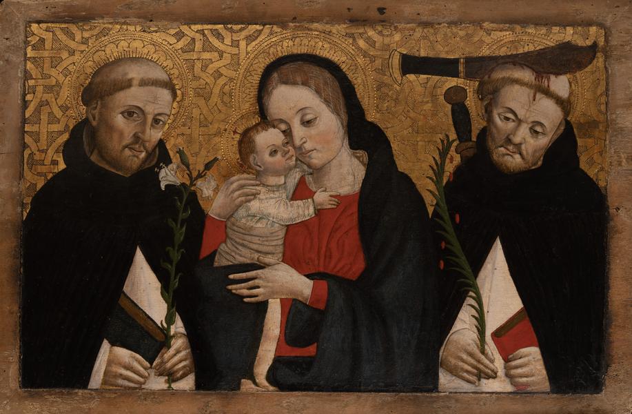The work was probably created by the Italian artist Vincenzo Foppa. In the painting, there is a combination of Gothic and Renaissance elements. A pronounced rhythmicity in the distribution of shapes and colour accents harmonises the composition. In the centre of the gilded background, the artist depicts Madonna holding the infant Jesus. To her right is St. Dominic in Dominican garments (white habit and black cloak). He is holding a lily, his attribute, a symbol of purity. To the left of Madonna is St. Peter the Martyr, a Catholic monk, Dominican preacher, and Inquisitor of Lombardy. He was tonsured a monk by St. Dominic. In 1252, Peter was killed in the forest near Barlassina on his way to Milan.