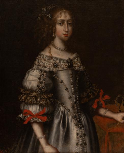 Eleonore Maria of Austria (1653–1697) was an Austrian Archduchess, queen consort, wife of the Polish-Lithuanian Commonwealth King, Grand Duke of Lithuania and Ruthenia, Michal Korybut Wisniowiecki, and daughter of Eleonora Gonzaga and Ferdinand III, Holy Roman Emperor, King of Hungary and Bohemia. Eleonore Maria's father died when she was four years old. Under the care of their mother, she and her sister Maria Anna were raised in Vienna. In 1670, Eleonore Maria married the King of Poland, Michal Korybut Wisniowiecki. The marriage was arranged for political reasons when Eleonore Maria was just 17 years old. The king died three years later, and their only son died at birth. Upon returning to the court, the Archduchess encountered her brother's closest friend, Charles V, Duke of Lorraine, who had been forced to leave his lands occupied by France. The difference in status hindered their relationship, but they married with the emperor's permission five years later. Leopold I appointed Charles governor of Tyrol. The duchess had six children, four of whom survived. After her husband's death, she fought to regain the Duchy of Lorraine for her son since shortly before her death, the Peace of Ryswick was signed, according to which France ceded the Duchy. Eleonore Maria of Austria died at the age of 44. The canvas depicts a young queen with a sad face, wearing a white dress of seventeenth-century fashion. She wears a string of pearls around her neck and a diadem on her head. The painting is a cropped copy of her ceremonial portrait.