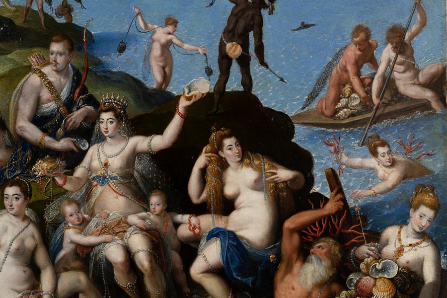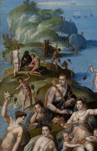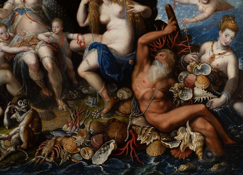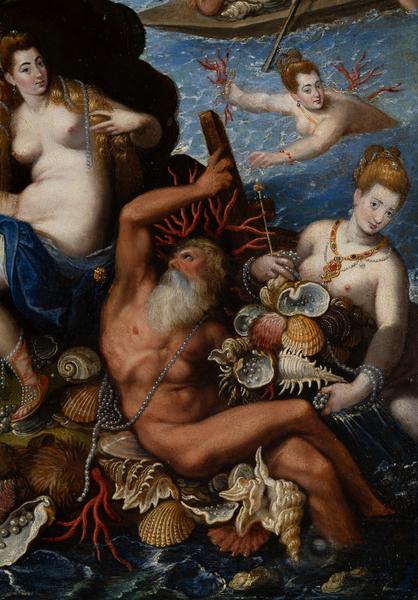 According to Giovanni Baglione's biography of the master, written in the first half of the 17th century, Ferdinando de' Medici commissioned the master to create, among other works, a small "studiolo" depicting the scene of "Coral Fishing". The painting also had to illustrate many nudes, among which were supposed to be portraits of beautiful Roman women worthy of attention as wonderful visions. "Coral Fishers" by Jacopo Zucchi is currently known in three versions, one of which is housed in the Borghese Gallery in Rome. However, only the composition from the collection of Borys Voznytskyi Lviv National Art Gallery is signed and dated by the artist, and it is the only one that presents a portrait of the Grand Duke of Tuscany Ferdinando I Medici, depicted as a hunter in the centre. Among other mythological figures, one can confidently identify the woman sitting next to Ferdinando – it is Clelia Farnese, the daughter of Cardinal Alessandro Farnese. Her portrait, painted by Jacopo Zucchi before 1587, is housed in the collection of the National Gallery in Rome. Clelia's presence next to Ferdinando is explained by their close relationship before the move of the then-cardinal from Rome to Florence. The cardinal's passion can be easily understood given that in 1581 Michel de Montaigne described Clelia Farnese as "the sweetest and most amiable of all women in Rome, the likes of which I have not been able to meet anywhere else". After moving to Florence in 1587 and assuming the title of Grand Duke of Tuscany, Ferdinando de' Medici married Christina of Lorraine for political reasons. Since then, he was to be reminded of the beautiful Clelia and their relationship by a double portrait, presented only in the Lviv painting "Coral Fishers", while the other two versions of this composition do not depict Ferdinand next to Clelia. The work's theme and symbolic content are directly related to the cultural and political atmosphere in Florence at the Medici court. The work somewhat reflects Ferdinand's interests in zoology and botany. The introduction of the scene with the pearl hunters had to echo the allegorical image of the newly discovered American continent, which was not accidentally called the Pearl Coast. Furthermore, in the 16th century, the myth of America as the embodiment of the idea of "Earthly Paradise" spread throughout Europe, providing impetus for the revival of the ancient myth of the "Golden Age" in European culture. The image of the "Golden Age", as an allegory of just rule and a metaphor for the Medici family's power, found particularly favourable ground in the literature and art of Florence. Pearls and corals have long been regarded as attributes of water. People considered the pearl born in the water in the oyster's body to be a symbolic expression of the person's indestructible divine values. According to the Gospel of Matthew (13:44-46), "The Kingdom of Heaven is like a merchant seeking for good pearls". Thus, pearls and corals in the philosophical and religious perception of the world of that time were allegories of the concepts of selection and exclusivity.