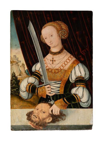 The iconography of this biblical story is extremely rich in European art due to its intense drama, psychological controversy, and content. The so-called Cranach style can be read in the Gallery's painting – in the composition, colour, and particularly in the completeness of the image of Judith. Her long arms, rounded shoulders, small bust, red-golden hair, and ruthless cold gaze create an impression of a slight eroticism. By killing the commander-in-chief of the Babylonian army, Holofernes, and saving the fortress city of Bethulia, Judith became a symbol of patriotism, the victory of the Virgin over the devil, purity and faith over lust and pride in the Judeo-Christian tradition. Like other righteous women of the Old Testament times, such as Esther, Judith is regarded as a typological prototype of the Virgin Mary. She is the New Eve who defeats Satan and the temptation that led humanity to the fall. The statement "weakness is stronger than human strength" is confirmed by the actions of Judith, the female counterpart of David, who defeated Goliath.