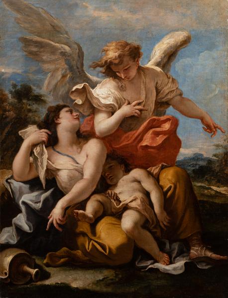 The "Hagar in the Desert" painting from the collection of Borys Voznytskyi Lviv National Art Gallery was inspired by the plot from the Holy Scriptures (Genesis 16. 1–16; 21. 9–21), the Jewish Torah (Book of Bereishit), and the Koran. Thus, according to the Old Testament legend, Abraham's barren wife, Sarah, gave her husband, the enslaved Egyptian Hagar, as a concubine to procreate. So, Hagar gave birth to Abraham's son, Ishmael. Fourteen years later, God sent Sarah her son Isaac, and she persuaded Abraham that the concubine with the child needed to be banished. Hagar desired to return to Egypt but got lost in the desert. When the water ran out, she wept in despair, preparing to die. God had mercy on her and sent the angel Gabriel, who guided the woman to the spring. Finally, Hagar and her son, who became the progenitor of the Arabs, settled in the desert of Paran. The Gallery's work is composed with rationally modelled dynamism and the coordination of figures in sharp baroque aspects with format diagonals. Of great importance are rhythmic echoes. The "active" diagonal line formed by Hagar's left hand and the angel's right hand resonates with Hagar's right hand, parallel to the diagonal. Meanwhile, the diagonal outlined by Hagar's tilted head and left shoulder and Ishmael's left hand resonates with the angel's left hand, parallel to the "passive" diagonal line. The location in the upper and lower segments of the intersection of the diagonals of the angel and baby Ishmael is symbolic. In the first case, it gives the impression of dominance in the composition, while in the second one – of maternal and angelic protection. The expression is enhanced by multidirectional movements deep into the picture space and towards the viewer, forming a "spatial baroque zigzag". The radiant range of silver-pearl, ash-blue, pink, and lilac colours, dominated by golden ochre (Hagar's robes) and red (the drapery wrapping the angel), indicates a close connection with Venetian art. The landscape background, as if "infused" with coolness and moisture, is painted with almost watercolour purity and lightness.
