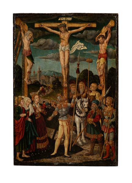 The most crucial scene of Christ's sacrifice in Christianity – the Crucifixion, described in the four Gospels, is one of the most common in European art and has a variety of iconography. It is one of the two main themes in medieval workshop painting, which young artists performed to get the title of guild master. It was repeatedly developed by Lucas Cranach the Elder, whose student from Wittenberg created the painting from the Borys Voznytskyi Lviv National Art Gallery collection. The Cavalry scene, depicted by Wolfgang Krodel the Elder, belongs to the iconographic type of "Crucifixion in the Crowd", popular in the late Middle Ages. The small painting depicts three crosses, with the side ones turned to the middle, rising above a group of people. The hands and feet of the crucified are nailed with large nails; there is blood on the mutilated legs of the robbers. The side of the Savior has already been pierced with a spear. Longinus, the Roman warrior, stands at the foot of the central cross. His head is raised, and he is frozen and enlightened by Christ's blood flowing down. On the right, with his hand raised, is a Roman centurion converted to Christianity. They are both dressed as Landsknechts. Standing on the left, Mary Magdalene draws the viewers' attention with her rich, bright red pleated clothes and fashionable hairstyle. Next to her are John the Evangelist and the Virgin Mary wiping her tears. The outfits of the men in the foreground and the Pharisees in the background, as well as the white horse in rich harness, create a colourful mosaic of rich red, green, bluish-grey, and ochre tones. The work's decorativeness is enhanced by parallel, horizontally grouped dark clouds pointed at the ends. A schematic panorama of the city of Jerusalem and a group of people heading towards it, as well as the men playing dice for Christ's clothes, create the thematic background in the depth of the work. The city outlines resemble Renaissance-style buildings typical of Europe. In general, the Passion of the Lord scene is presented as if the action took place in Germany in the early 16th century. It is deprived of iconographic elements developed in medieval Catholic Christology (for example, the swoon of the Virgin Mary according to the vision of St. Brigid) and is interpreted without the usual drama of the situation. The calm tone, accurate reproduction of events, and a keen interest in the setting and costumes are reminiscent of eyewitness accounts. The establishment of Protestantism caused those signs. Furthermore, through such details, the artist conveyed his shock at the cynicism and vanity of his time, brought about by the recent events of the peasant war and the defeat of the uprisings. Although Protestantism rejected the decoration of religious buildings with artistic works, a number of religious themes still found their place in the space of the post-Reformation church. These include the theme of the Crucifixion. Depicting scenes of Christ's martyrdom did not contradict the Protestant understanding of faith. According to Martin Luther, it reflected the idea of eternal salvation and was permeated with religious didactics. The heyday of the Renaissance in Germany occurred in the first half of the 16th century, a time of sharp class conflicts. New ideals and worldviews were directly reflected in fine arts. Albrecht Dürer, Lucas Cranach the Elder, and Hans Holbein the Younger were among the most prominent artists of the German Renaissance. Lucas Cranach the Elder maintained close ties with the humanists of his era. He instilled his commitment to progressive ideas in his students, including Wolfgang Krodel the Elder. His painting "Calvary" (1535) echoed the events of the tragic end of the Peasants' War of 1525. Departing from the traditional iconography, the author dressed the Roman legionaries in the costumes of his contemporaries – the Swiss Guard and Landsknechts – military mercenaries who brutally suppressed the uprising. "Calvary" is the only painting by Wolfgang Kroedel the Elder in Ukraine in which the biblical event is recreated according to the realities of that time.