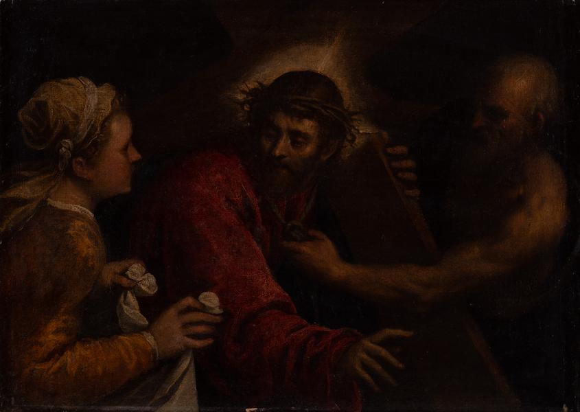 The painting depicts Jesus Christ carrying a cross. Jesus is depicted wearing a crown of thorns and facing a woman holding a veil. None of the four canonical Gospels mentions Veronica and her veil. However, in the apocryphal Gospel of Nicodemus, the work of Eusebius of Caesarea, "Historia Ecclesiastica", there is a mention of Veronica, a woman from Jerusalem. When she saw Jesus carrying the cross to Golgotha, Veronica felt pity for him and offered her veil to wipe the blood and sweat from his face. The image of his face was imprinted on the veil, and later this relic became known as the "Veil of Veronica". The name Veronica is considered an anagram of the expression "true image" ("icona vera"). The scene illustrates the sixth of the fourteen Stations of the Cross. The Stations of the Cross tradition originated in the fifteenth century among the Franciscans and became widely practised by the Catholic Church. The rite involves people stopping at each of the fourteen images for prayer. Many artists have depicted the Stations of the Cross theme. The subject of Christ and Veronica is also found in the works of Titian, the teacher of Palma il Giovane.
