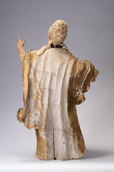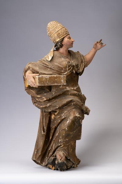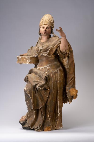 The sculpture of the saint is one of the allegorical figures that once stood in the Church of the Assumption of the Virgin Mary in the village of Navariia. With her right foot forward, the contrapposto figure is carved in a relatively static pose. The woman's gracefully turned head is crowned with a tiara under which one can see strands of dark hair arranged in a neat bun; her left hand is raised, while the saint's right hand holds a sizeable closed book. The woman wears a corset that follows the lines of her body, and a long skirt with a restrained pattern of drapery, without excessive folds and intersections. She wears a cape over her shoulders, fastened at the chest.