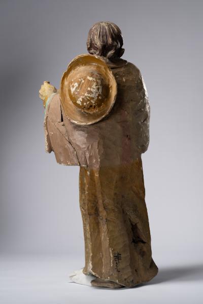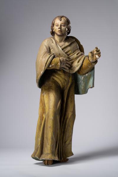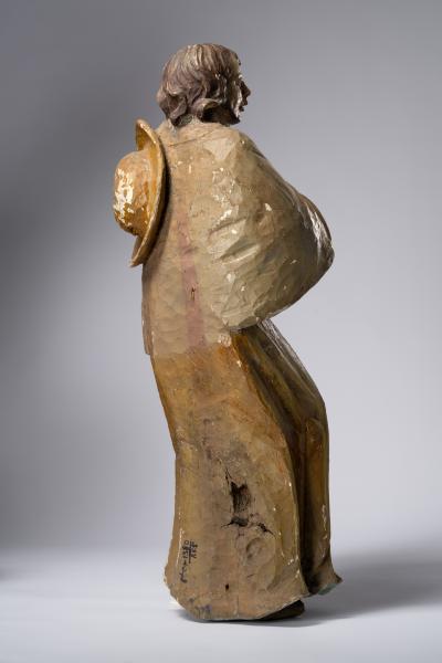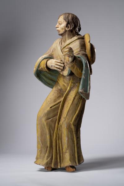 The full-length figure of Saint James the Elder is depicted with his right foot outstretched, and his head slightly turned to the right. The man is dressed in a long yellow tunic, leaving only his feet exposed, and his shoulders are covered by a wide drapery folded over his chest, one edge of which falls from his left hand. The saint's right hand is pressed against his body, while his left hand is half-bent with open fingers: its pose suggests that it could be a traveller's cane. The artist has reproduced the noble face in a specific way – with a high forehead, clearly elaborated arched eyelids covering almond-shaped eyes, and a wide mouth with an expressive beak-like upper lip, surrounded by a small beard and short, wavy dark hair. A unique element of the saint's clothing is a brown hat with a wide brim. This was one of the attributes of James the Elder, the patron saint of pilgrims.