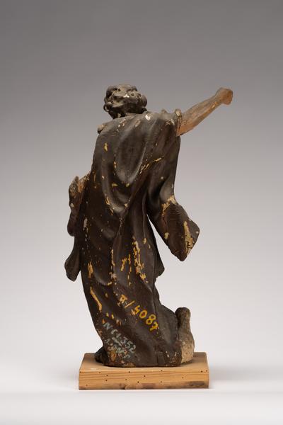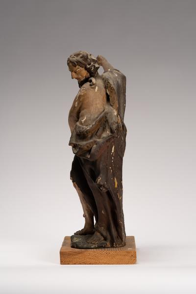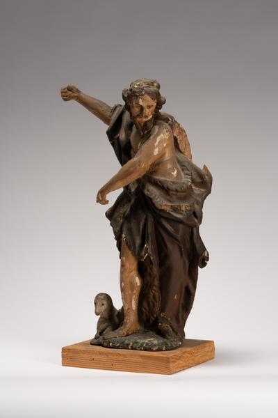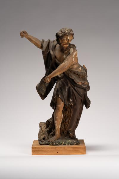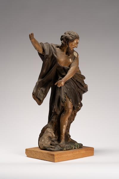 John the Baptist is the Forerunner of Christ, a prophet, the patron saint of ascetics, a hermit, and the son of the priest Zechariah and the Righteous Elizabeth. It was from him that Christianity inherited the concept of ablution and purification, which later became the Sacrament of Baptism. The sculptural composition depicts the expressive figure of St. John with theatrically extended arms. His athletic body is clad in a cilice – a cloak made of camel hair, with one end draped over his right shoulder and the other wrapped around his hips, flowing down and leaving his right leg exposed. The artist tries to convey the material's texture, engraving the edges of the cilice with lines. The drapery is covered with static straight lines with sharp endings. The elongated ascetic face with sunken cheeks has an expression of alienation and obedience. Eastern iconography presents John the Baptist as very thin, with uncut hair and beard, barefoot. Often, John is depicted with a lamb, as in this sculptural composition.