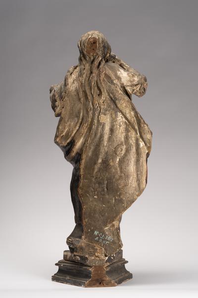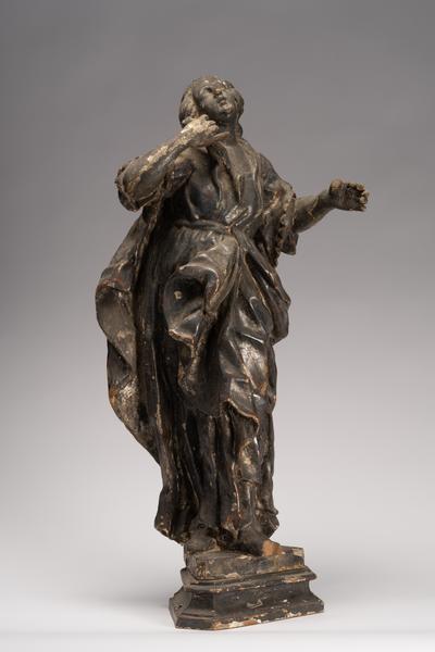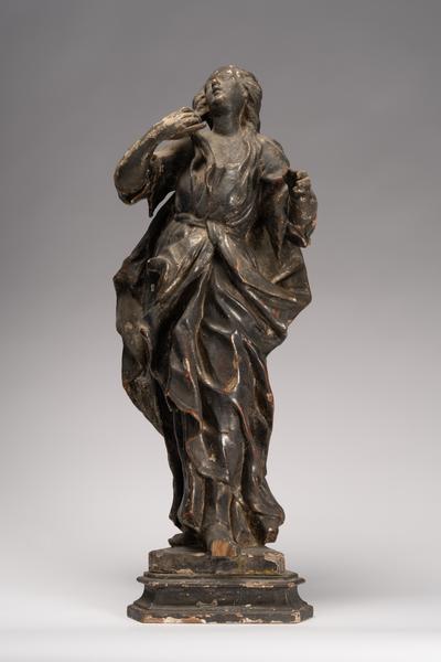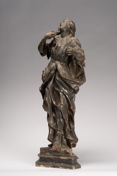 A full-length graceful figure of the saintly woman is placed on the carved hexagonal stand. Her body is curved in an expressive pose; her head is thrown back. Her arms are theatrically spread, and her right leg is put forward, imitating a gait – everything is subject to movement. On the woman's head is wavy hair combed back. It falls down to her back and shoulders in free voluminous strands. The young woman's pretty face is conveyed in an expression of deep melancholy thoughtfulness. The saint wears a long dress with a waistband that wraps the figure, shaping the body's curves. The garments are modelled by delicate lines that sometimes refract, forming recessed planes. Draperies are carved with moderate vertical strands, which, falling down, turn into raging waves of folds, rolling on top of each other. The sculptor draws attention to the inner world of the saint through external dynamics.