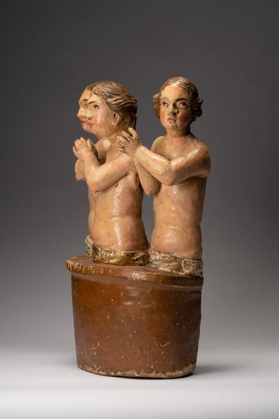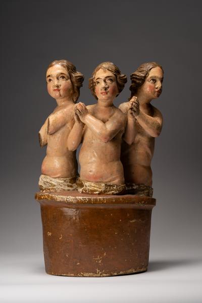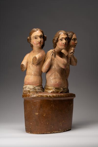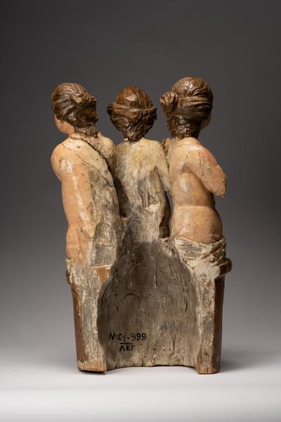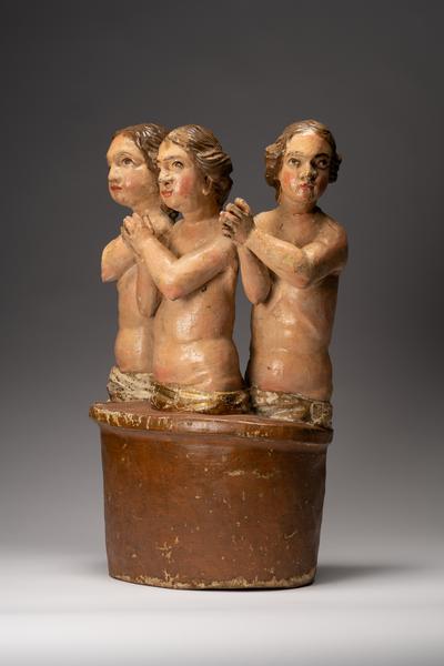 Faith, Hope and Charity are the three Christian virtues Saint Sophia named her children; she brought them up in devoutness and love for God. Faith was twelve years old, Hope was ten, and Charity was nine when they were subjected to terrible tortures for their Christian faith. A cauldron of boiling tar and oil was one of the tortures for young martyr girls. Three children's polychrome figures below the waist are depicted in a cauldron; their hands are prayerfully folded on their chests, which indicates their unquestioning faith. Only loincloths wrapped around the thighs cover the naked bodies of young girls. The master tries to convey the anatomy of children's figures, outlining in smooth lines, lowered shoulders, rounded bellies, and small hands. On their heads are incised strands of dark hair fixed on the back of their heads. Faith, Hope and Charity are not given any individual portrait features. The master depicted each with plump cheeks, a small snub nose, and a wide, tightly closed mouth. The proud glances of the girls are directed upwards. There is readiness for self-sacrifice in their glances. Faith, Hope and Charity were a part of the sculptural composition, which traditionally also included the figure of their mother, Saint Sophia. The work is characterised by softness of forms, emotional balance, and slow dynamism.