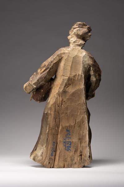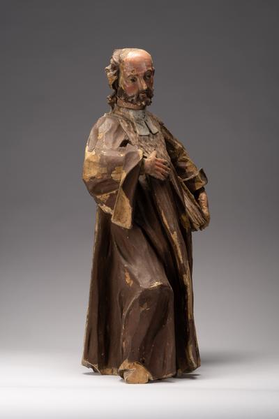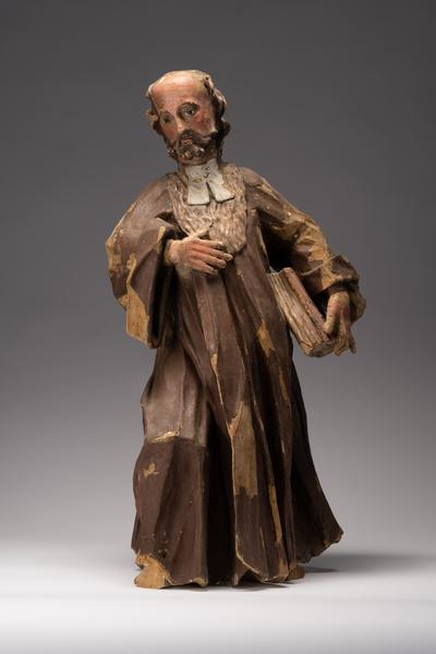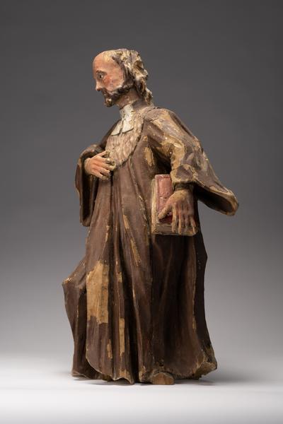 The sculpture of the saint is reproduced in a dynamic posture, with somewhat slow movements. A clear outline distinguishes his full-length contrapposto figure; his right foot is put forward. The man's right hand lies on his chest; he holds a large book in his left hand. The saint is dressed in a long soutane with wide sleeves. The straight lines of the garment's draperies are formed with the help of massive folds that wrap the figure, falling in vertical strands with precise edges. The saint's face is conveyed with an expression of frozen detachment and peace; his gaze is directed downwards. The man's hair and beard are made with the shallow deepening of smooth wavy lines. The sculpture is modelled with verticalism, slow movement, and smooth texture. The baroque movement loses expression in religious images of the Lviv sculptural school of the second half of the 18th century; gentleness appears on the faces of the characters. Despite the image's modesty, the emotional Baroque notes are still felt in the sculptural composition.