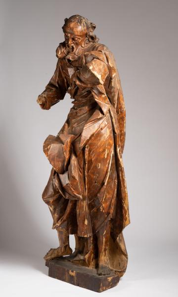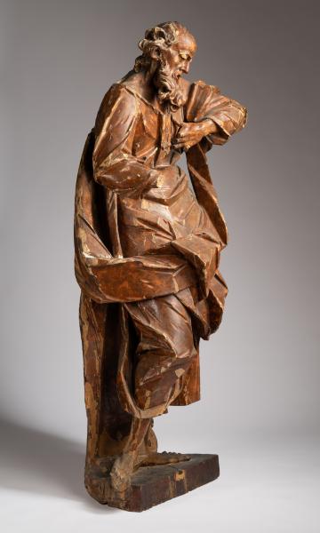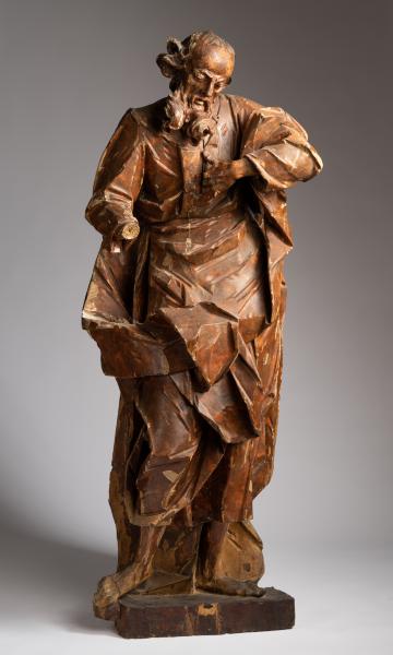 The Apostle Peter (secular name – Simon) was one of the twelve apostles and the eldest disciple of Christ. The full-length figure of Peter, leaning slightly to the right with his foot extended, is depicted wearing a long tunic and a himation draped over his left shoulder. The image's intense emotionality is emphasised by the dynamic folds of the garment, the entire surface of which is covered with straight, ribbed lines intersecting to form planes of various shapes, often with sharp angles. The apostle is depicted as an aged, emotionally charged man with vibrant, sharp features, expressing contemplation and detachment. The image's distinctive features include an elongated face oval with prominent cheekbones and sunken cheeks, a high forehead, eyebrows raised above the bulging eyes, a straight thin nose and a long, parted beard. The expressively ruffled curls of the hair and beard are modelled with shallow engraved lines. The harmoniously assembled figure demonstrates the emotionally fulfilled image of a saint. According to Hornung, the figures of Saint Peter and Saint John were created by Franciszek Oledzki for the altar of the chapel in Our Lady of Czestochowa Church.
