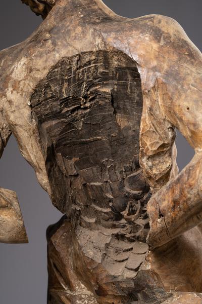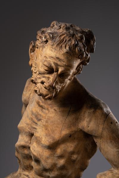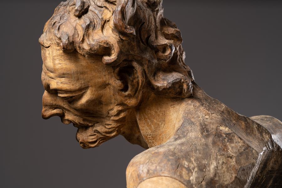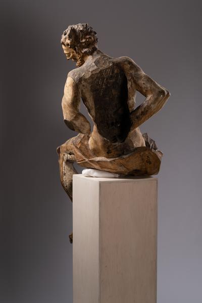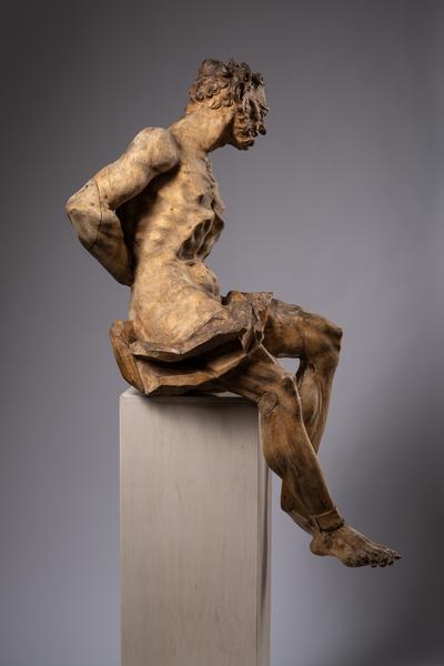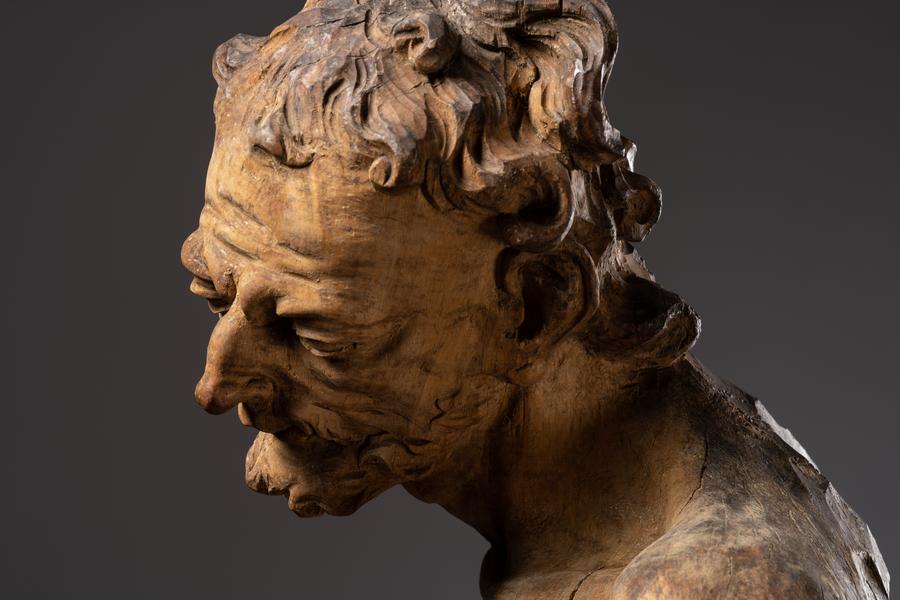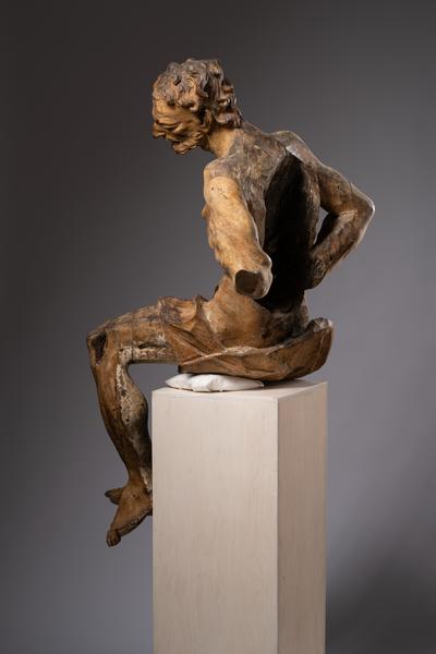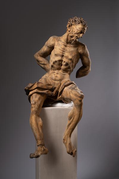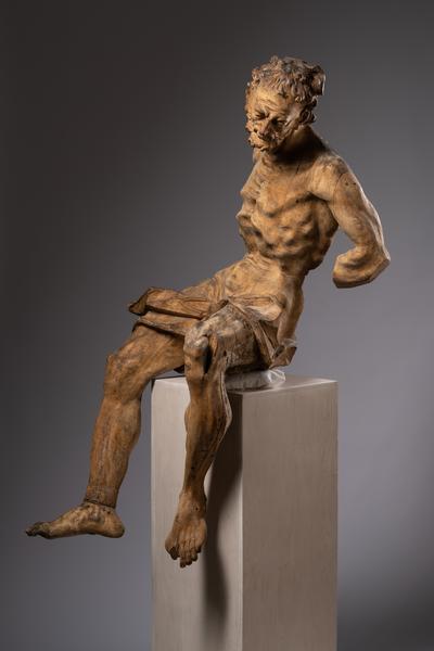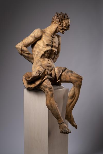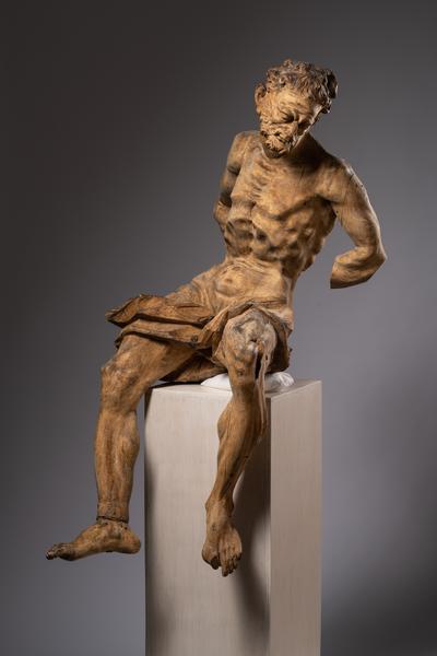 In the 80s of the 18th century, Franciszek Oledzki received an order to make an ensemble of sculptures from two prisoners; they were designed to decorate the upper part of the church's central altar. The artist masterfully reproduced the exhausted body of the prisoner – the tension is felt in every curve. Skilfully using a chisel, the sculptor depicted the man with a protruding chest; the skin outlines his ribs; his arms and legs are muscular, and an abdominal cavity is sunken. The image of pain and suffering froze on the man's face. The prisoner's face is characterised by the typical face form of Oledzki's works; his nose is straight and slightly protruded. In an original manner, the author reproduced hair curls that look dishevelled. The external effect prevails in plasticity, which is felt in the figure's pose and the theatricality of the movement.