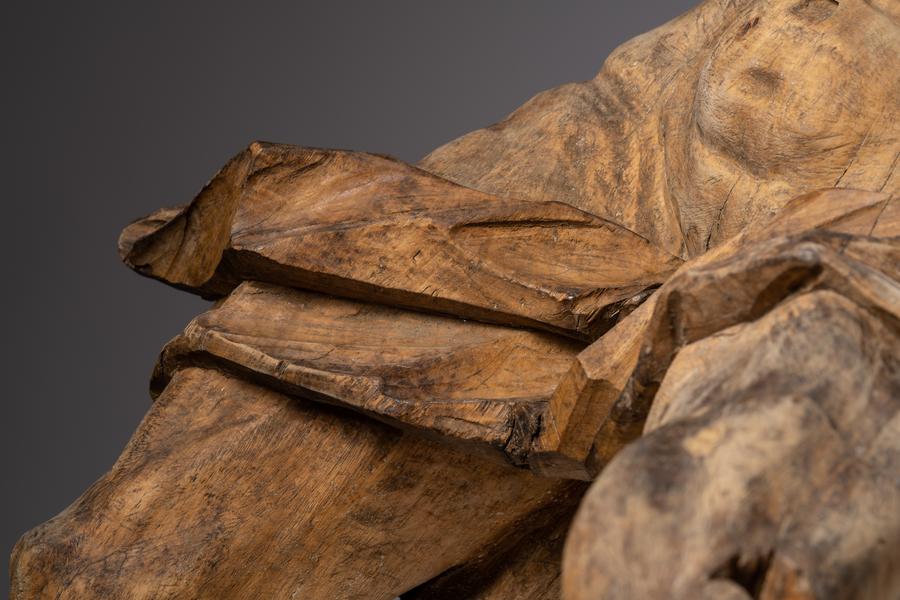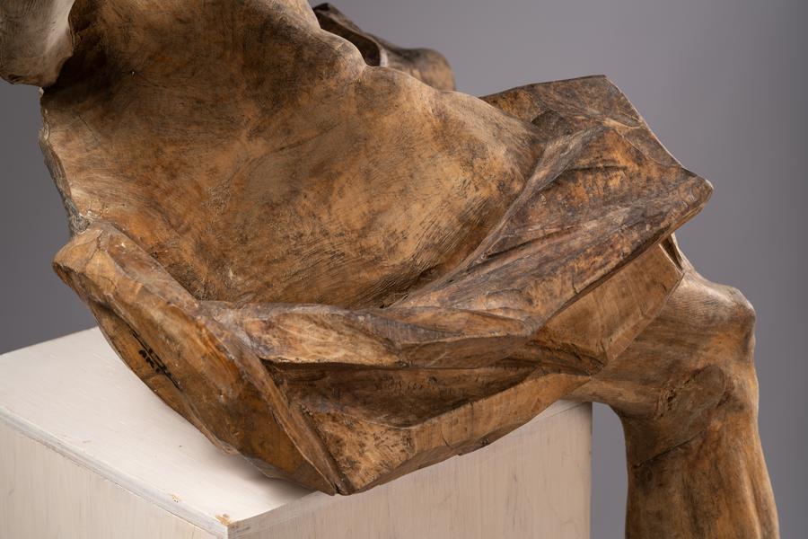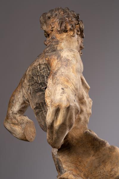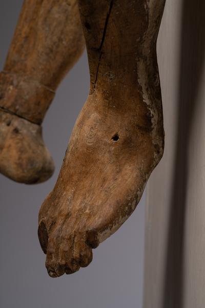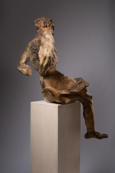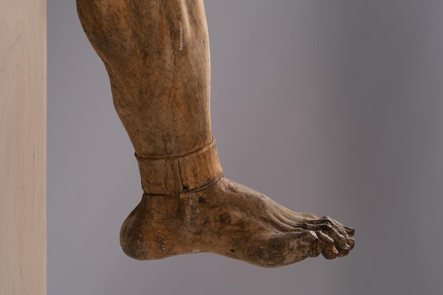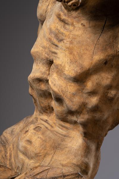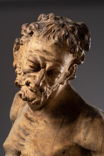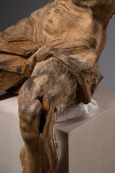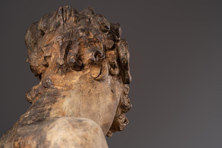 In the 80s of the 18th century, Franciszek Oledzki received an order to make an ensemble of sculptures from two prisoners; they were designed to decorate the upper part of the church's central altar. The artist masterfully reproduced the exhausted body of the prisoner – the tension is felt in every curve. Skilfully using a chisel, the sculptor depicted the man with a protruding chest; the skin outlines his ribs; his arms and legs are muscular, and an abdominal cavity is sunken. The image of pain and suffering froze on the man's face. The prisoner's face is characterised by the typical face form of Oledzki's works; his nose is straight and slightly protruded. In an original manner, the author reproduced hair curls that look dishevelled. The external effect prevails in plasticity, which is felt in the figure's pose and the theatricality of the movement.