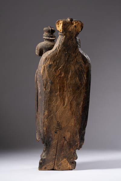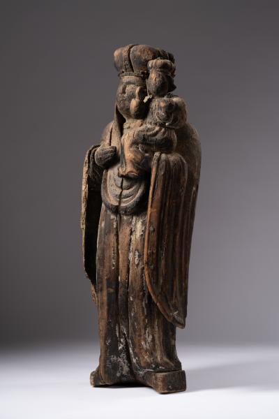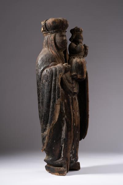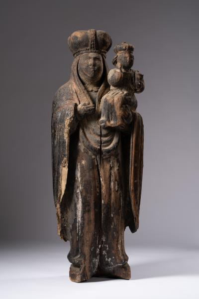 Virgin Mary is the protectress, patroness, and respected saintly woman whose image can be considered part of a particular composition or independent image. The iconographic type of Virgin Hodegetria is a full-length figure reproduction of Mary holding little Jesus in her left hand. The sculpture from the village of Hvizd belongs to the Western iconographic type "Queen of Heaven", where, unlike the Eastern one, the head of the saintly woman is not covered with a veil but topped with a crown. In Ukraine, this type of image became widespread in Galicia. The frontal composition of the sculpture is designed for the interior. Soft modelling of Virgin Mary and little Jesus' faces is felt in the work. Using only smooth lines and rounded shapes, the folk master reproduced the calm image of a saintly woman with a child – the personification of a loving and strong woman.