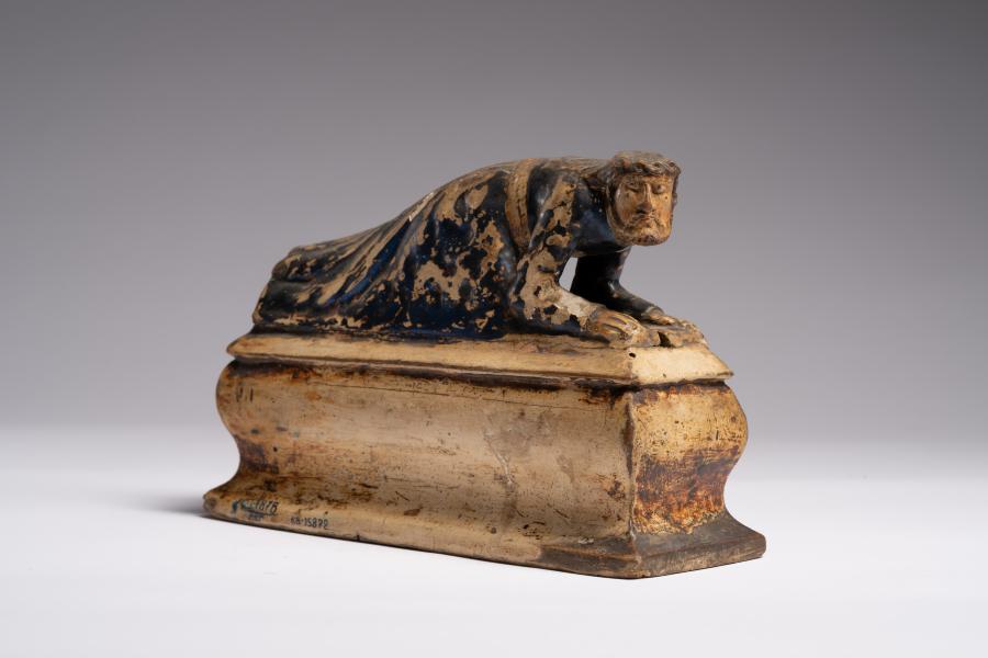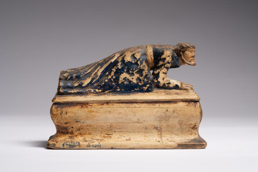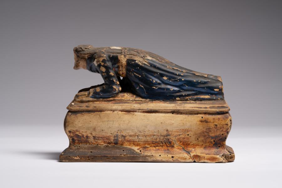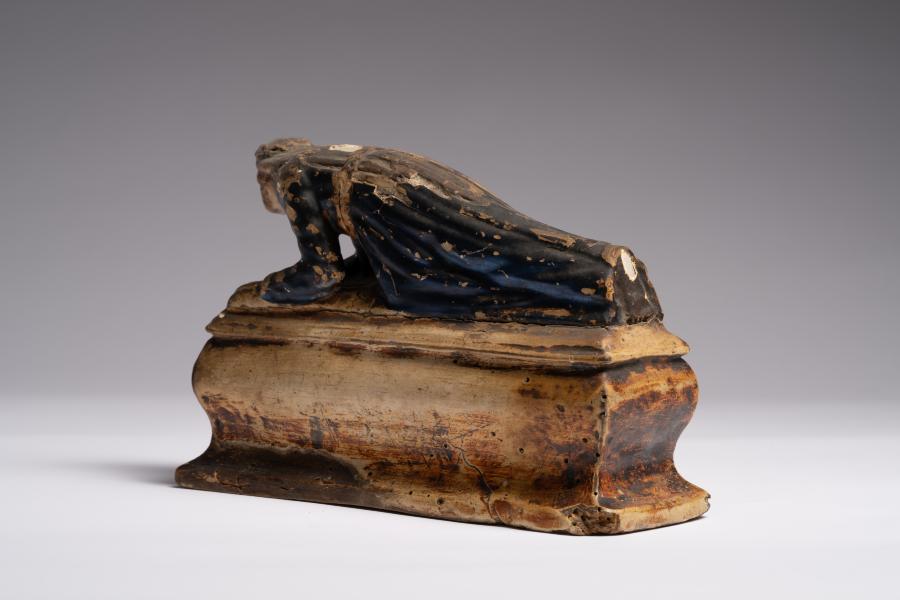 In their works, folk masters rather conditionally followed the canonical iconography. It resulted from understanding certain images from the perspective of folk vision and local traditions. An extraordinary interpretation of the plot is distinguished by the sculptural image of Christ, in which the author's approach is felt. In the master's imagination, the figure of the risen Saviour appeared on the tomb. The figure is carved from a single piece of wood. Christ is reproduced on his knees, his arms bent in the elbows and leant on the coffin's lid. The slouched figure is dressed in a long, saturated blue tunic with a waistband. On the head of Christ is a crown of thorns, interpreted with twisted, smooth bundles. On an elongated face, the artist schematically reproduced his eyes, nose, and mouth; he marked with a shallow carving the texture of the beard on the oval face. The soft modelling of the image distinguishes the sculptural composition. The draperies of the garment are interpreted by gentle horizontal strands, made with shallow deepening, that repeat the movement of the body of Christ. Soft clothing lines are rounded along the contour, and the gentle expression of a rough face enhances the inner peace of the saintly man.