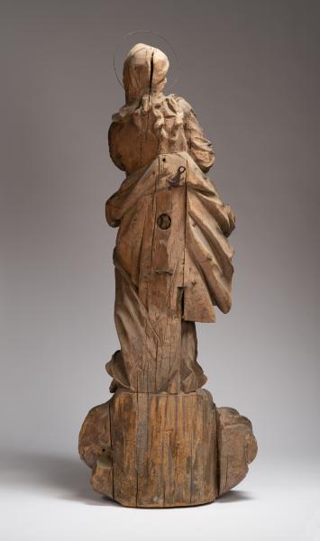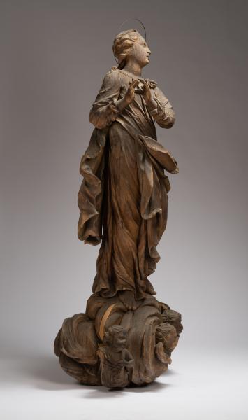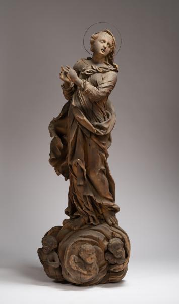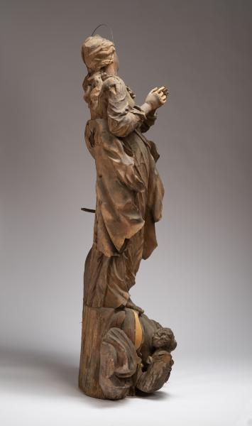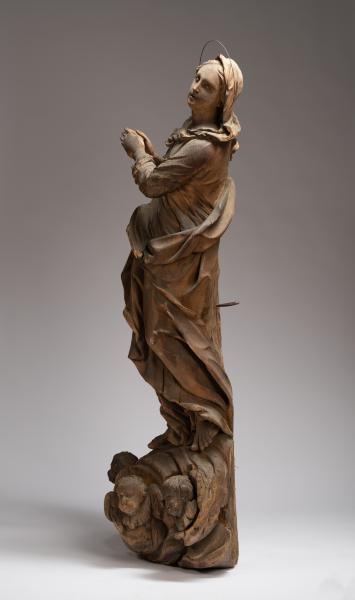 The sculpture demonstrates the image of Virgin Mary in a characteristic Baroque graceful pose with a diagonal composition. The full-length figure of the saintly woman, with prayerfully folded arms, stands on a cloud surrounded by two cherubim and a waist sculptural image of an angel. The linear sophistication of the Baroque consists in modelling the garments of the saintly woman, which, with curved waves of draperies, wrap her figure, adjoining the body in the upper part, gradually hanging in the air with bizarre curves. Virgin Mary's head is thrown back and bent towards her left shoulder. From under the veil, which covers only the top of the head, wavy hair strands are seen; they are fixed in a neat hairstyle. An expression of prayerful thoughtfulness and detachment is frozen on the saint's pretty face, which is enhanced by the look from her upwardly turned eyes. Harmonious proportions of forms and academic modelling of the anatomy of the human body distinguish the aesthetic value of the work.