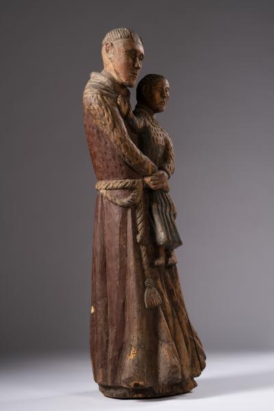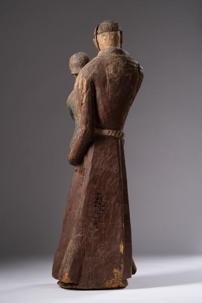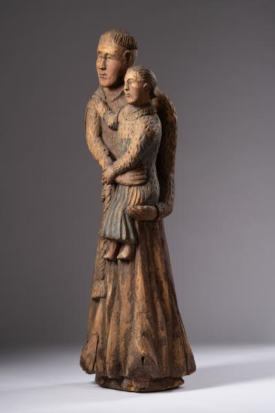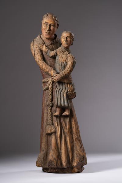 In churches, mainly Roman Catholic ones, sculptures of saints are located in altar compositions, side chapels or at the entrance. Sculptural images of some saints can be found in almost every temple – for example, the figures of Anthony of Padua. The saint was born in 1195 in Lisbon (Portugal). He was a Catholic priest, a monk of the Franciscan order, and a preacher. He healed the sick, helped discover lost things, and was considered the patron saint of travellers. In the thirteenth century, Anthony was canonised by Pope Gregory IX, who, during canonisation, read out a description of 53 miracles performed by the saint. Anthony the Great was depicted in the Franciscan habit with the child Jesus in his arms; also, he was often depicted with a lily. The Little Christ symbolises St. Antony's vision in Camposampiero and reflects his love for the human image of Jesus and his close relationship with God. The sculptural representation conveys the image of a monk wrapped with a rope with large knots, typical of the Franciscans, and in a long coarse cloth soutane with a hood. The saint holds a little Jesus dressed in a long blue tunic, decorated at the bottom with parallel lines imitating folds and reproducing a child's movement. The elongated face ovals of Anthony the Great and Christ are roughly carved. Arched eyebrow lines smoothly turning into a protruding wedge-shaped nose, wide cheekbones, and a straight mouth with plump lips characterise the figures' faces. The reproduction of the saint's tonsure is unique (shaving the head as a sign of belonging to the church), as there is no hair above the forehead, which was not characteristic of the image of Anthony the Great. Christ's hair is carved with incised straight lines that start from the forehead and fall to the back of the head. The sculptural composition is depicted in a naive manner typical of folk masters; it conveys familiar images sincerely and without pathos.