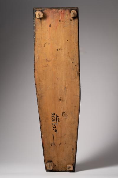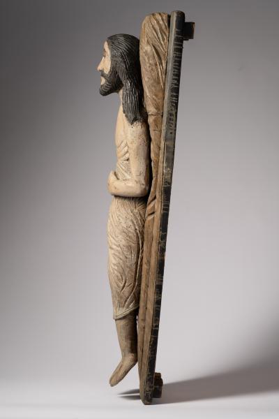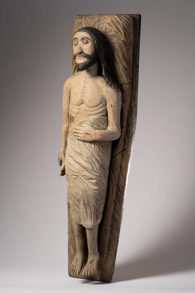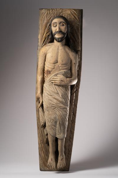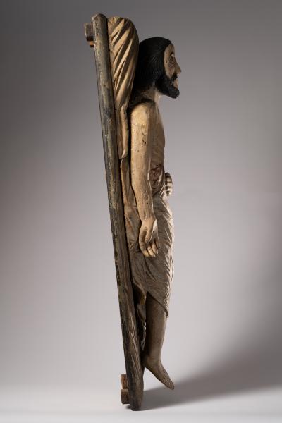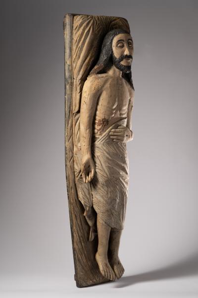 The iconographic image of Christ from the Zhydachiv region is associated with Easter ritual symbolism. On Good Friday, Christians traditionally go around the temple carrying a shroud – an image of Christ lying in the tomb. After the procession, the shroud is placed in the church, where it remains for a while. Since the sixteenth century, the shroud has become an obligatory attribute of worship. The most common are pictorial or embroidered images, but there are also carved from wood, the laconic plot of which has minor differences in iconography. The three-dimensional wooden shroud, following iconography, depicts the carved dead body of Jesus on a low stand with traces of nailing to the cross and a deep wound from a spear. His head is barely bowed to his right shoulder; his left arm lies on his stomach, and his right one is extended along his body. The elongated figure of Christ is made of a single piece of wood. Having imperfect knowledge of the anatomy of the human body, the folk master depicts broad shoulders turning into thin hands with massive palms, wedge-shaped flat feet, and a schematically defined chest with clear parallel horizontal lines imitating ribs, outlining a sunken abdominal cavity. The face of Christ is characterised by features untypical of the national type. An oval face with a massive chin emphasises the light carnation of the body; his face is outlined with a short beard and framed with straight strands of dark hair. The eyes of Christ are large, almond-shaped, with bulging eyelids and a drooping outer corner. The lifeless image of the Savior enhances the wide mouth and straight nose with dilated nostrils under low brow ridges. A long loincloth that covers the hips and falls below the knees is modelled by shallow carved lines that randomly cover the entire surface without repeating the outlines of the body.