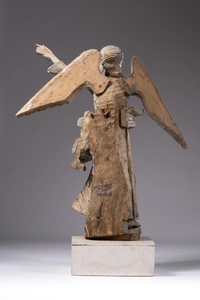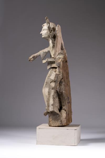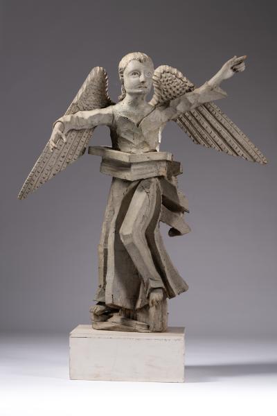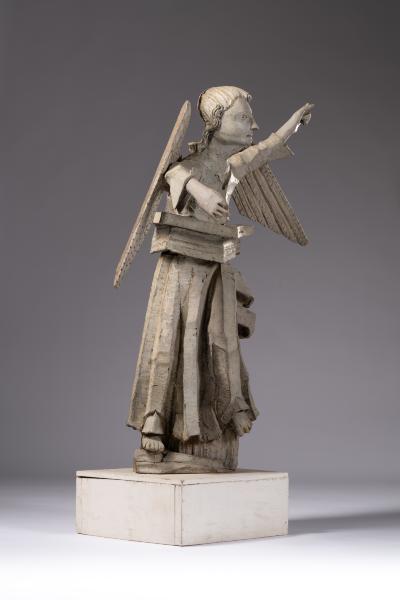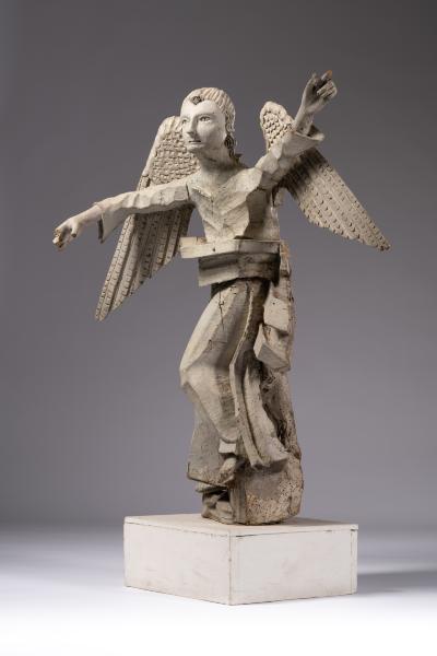 The same style of execution and common interpretation of the image unites three works from the village of Sharpantsi. The sculptures belong to the same artist and are distinguished by their graphic representation of the human figure. The elongated figure of the angel, in the form of a young man, is shown in motion, emphasised by the right leg bent at the knee and the arms outstretched. The slender silhouette is not anatomically correct. The restrained flow of the vertical lines of the drapery is formed by ribbed ridges, without smooth transitions, with clear folds. The strict geometry of the drapery in the lower part of the sculpture is softened by the calm pattern of the tunic bodice, modelled by recessed irregular planes. Attention is drawn to the peculiarly elongated face, framed by engraved strands of hair which, in the Baroque tradition, fall over the shoulders and form a distinctive forelock above the forehead. The elongated face has a low forehead, clearly defined eyes, a straight nose, and a wide mouth. The work is characterised by its restraint in conveying the image of an angel.